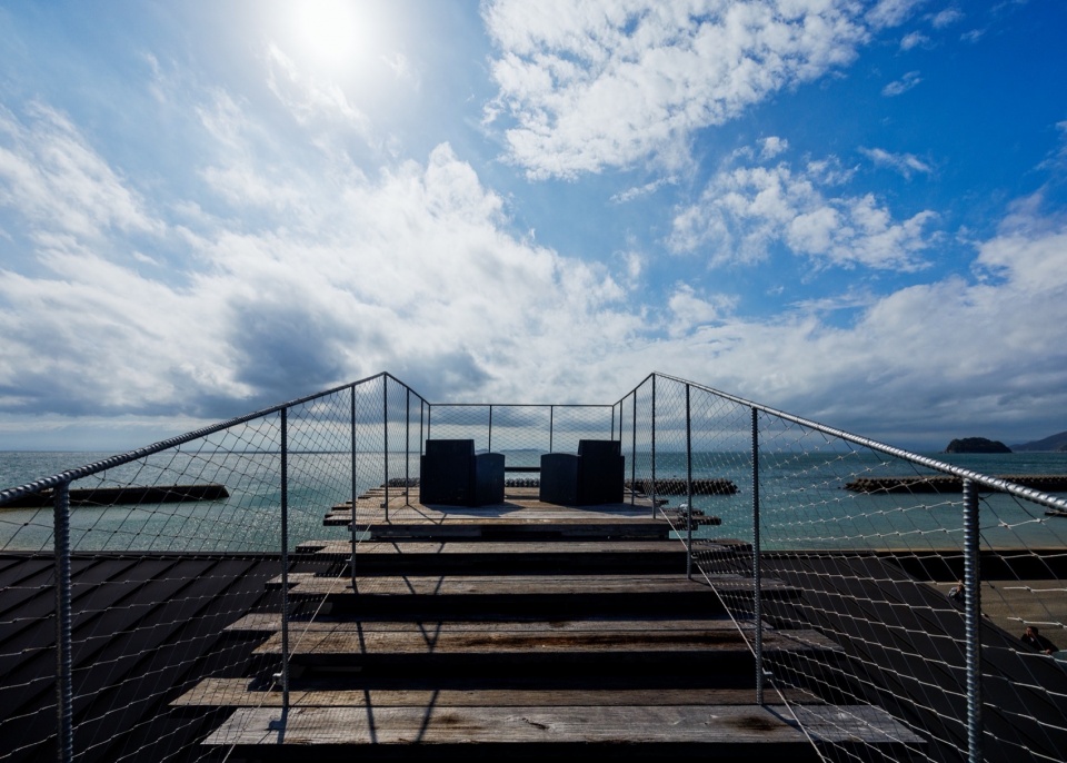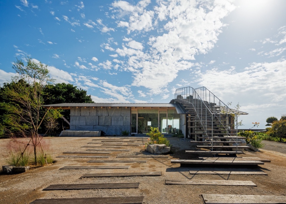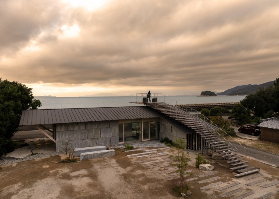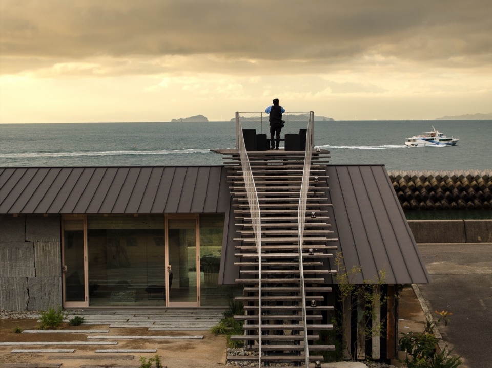 The approach is a combination of road movie-style plantings and wooden sleepers, and as one walks along these steps they can see the Seto Inland Sea from the roof and feel the sea breeze.