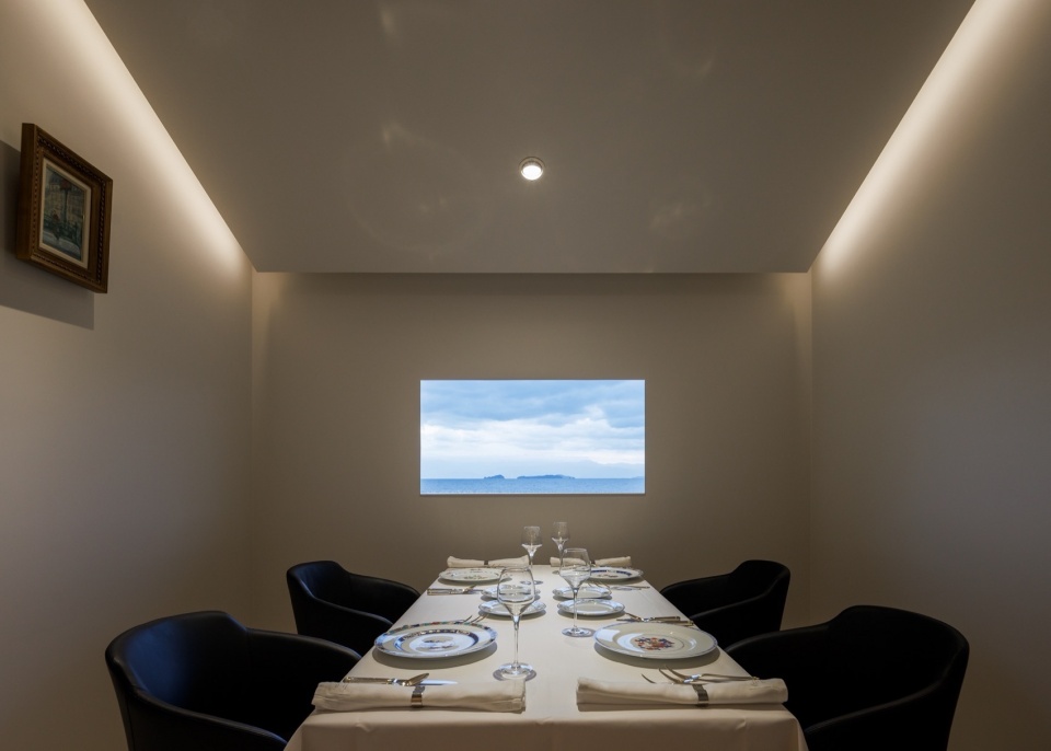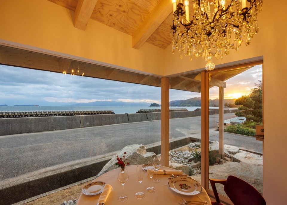 On the seashore of Oshima Island in the Seto Inland Sea, a place known for the beauty of its many islands (Tato-kai), we designed a quiet French restaurant that blends in with its environment using local stone (Oshima stone) and wood.