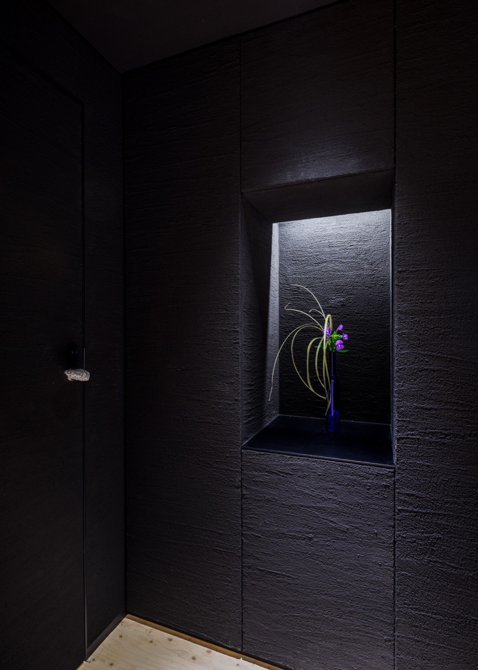 ▼设计结合了大岛石不规则的天然肌理与回收的旧船底木板,uneven surfaces of the Oshima stone combined with recycled weathered ship bottom planks