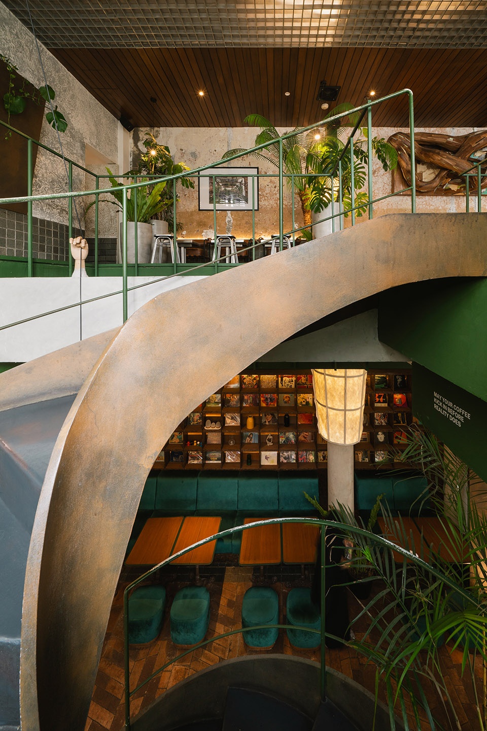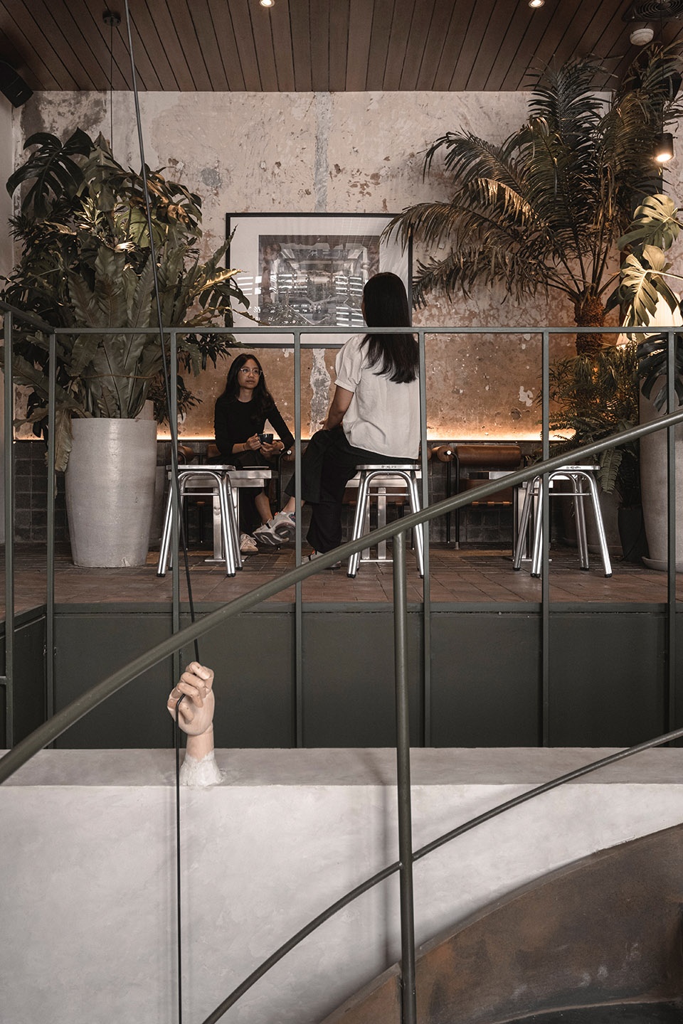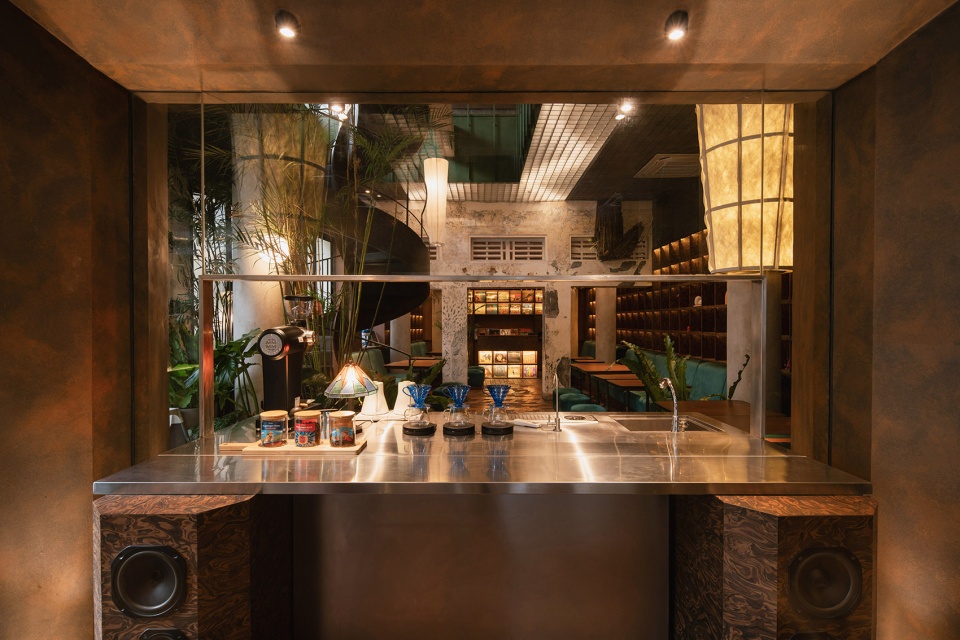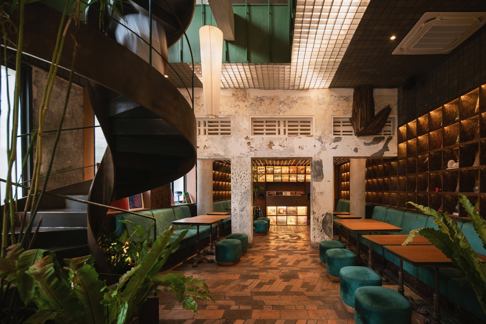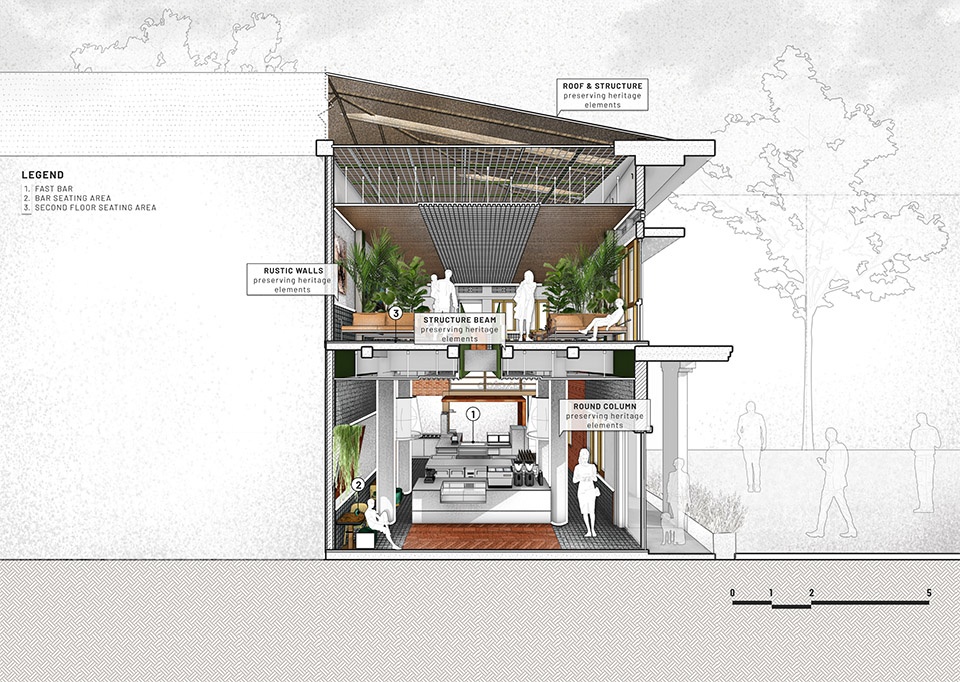 An aged Haya tree ironwood sculpture, created by artist Wisnu Ajitama, serves as a contrasting focal point against the preserved facade on the exterior, while introducing multiple compress and release spaces on the interior through the use of various corten artistic spatial frames. The design prioritizes allowing the environment, history, and culture to shape the project. It serves as a small proactive prototype of architectural practice focused on reusing and refurbishing as the primary consideration when designing and reshaping our already overbuilt cities. This approach, which prioritizes reuse over demolition, can reduce costs, enhance environmental efficiency, and preserve functional structures that can continue to serve their purpose for years to come.