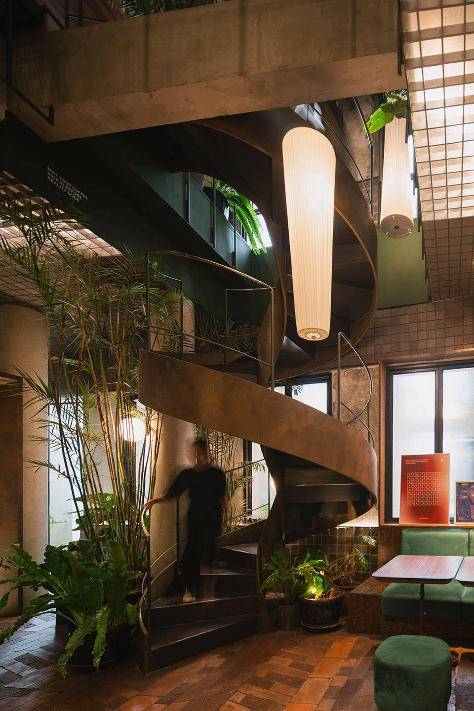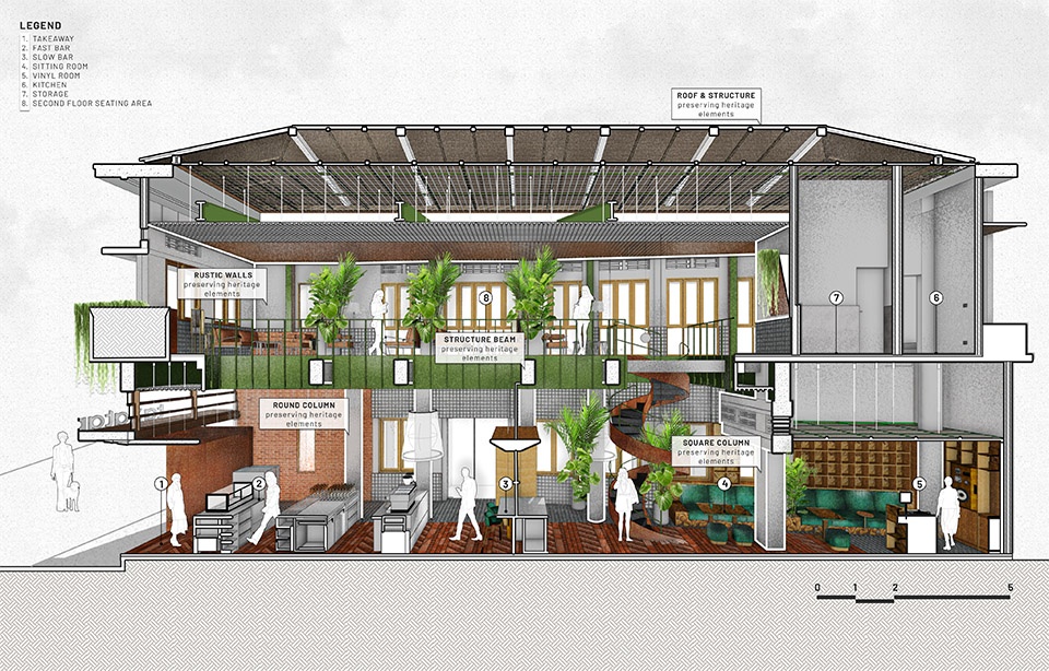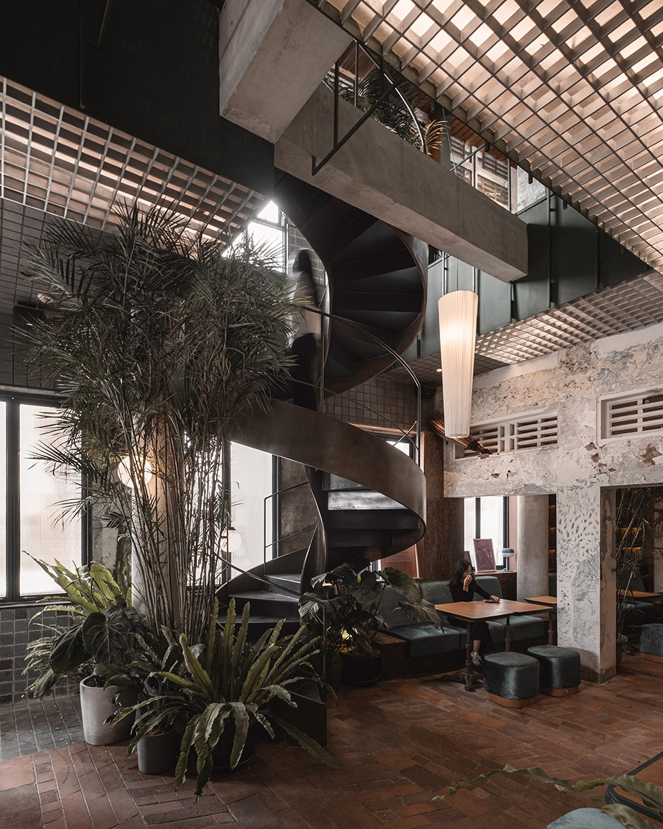 由艺术家Wisnu Ajitama创作的老海亚树铁木雕塑,作为外部保留立面的对比焦点,同时通过多种不锈钢艺术空间框架在内部引入多个压缩与释放空间。设计优先考虑让环境、历史和文化塑造项目。这是一个小型的积极原型,展示了以再利用和翻新为首要考虑的建筑实践,旨在设计和重塑我们已经过度开发的城市。这种优先考虑再利用而非拆除的方法,可以降低成本,提高环境效率,并保护能够继续发挥作用的功能性结构,服务多年。