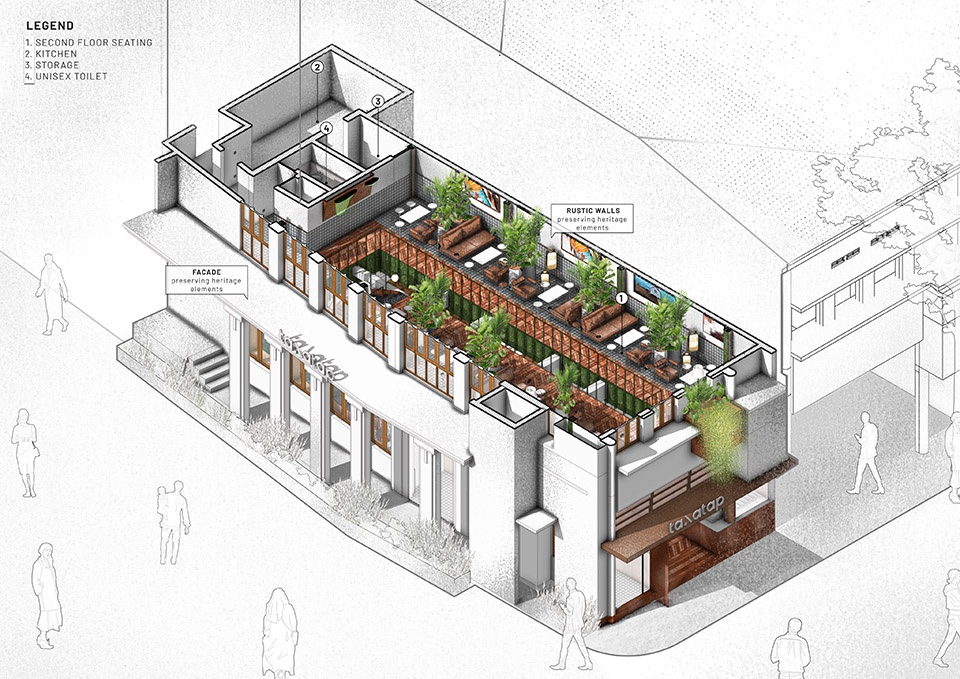 Tanatap Heritage Garden is a small architectural intervention that transformed a once-mediocre vertical building, which stood as a barrier in Braga’s heritage shophouse, into a creative melting pot that celebrates its historical significance. The project’s main challenge from the outset was to apply primary methods for the adaptive reuse of an existing Dutch heritage shophouse structure, converting it into a restaurant and coffee shop situated in the middle of a block on Braga Street, Bandung. The shed, originally a warehouse, provided us with the opportunity to work with many original elements inherited from its previous uses, such as existing frames, walls, and facades.