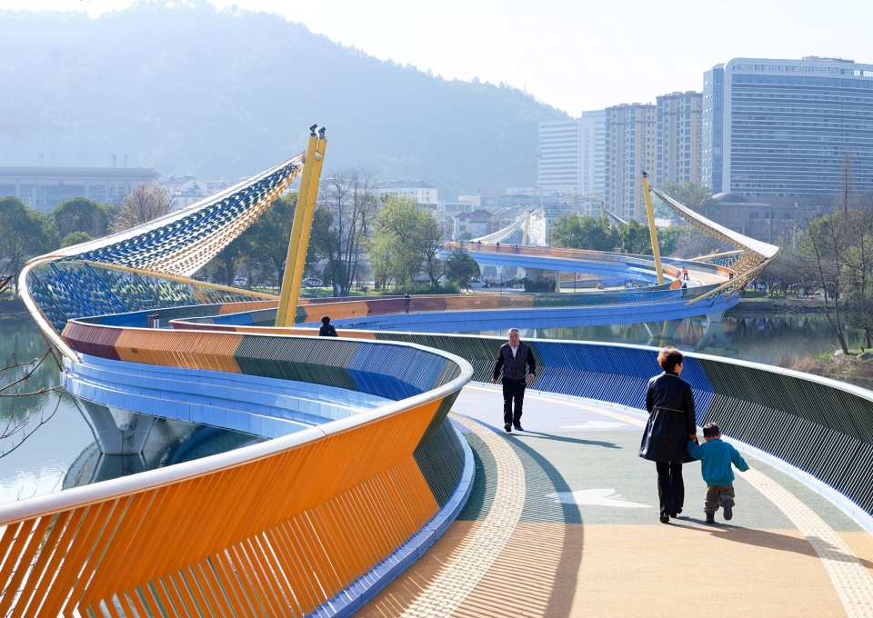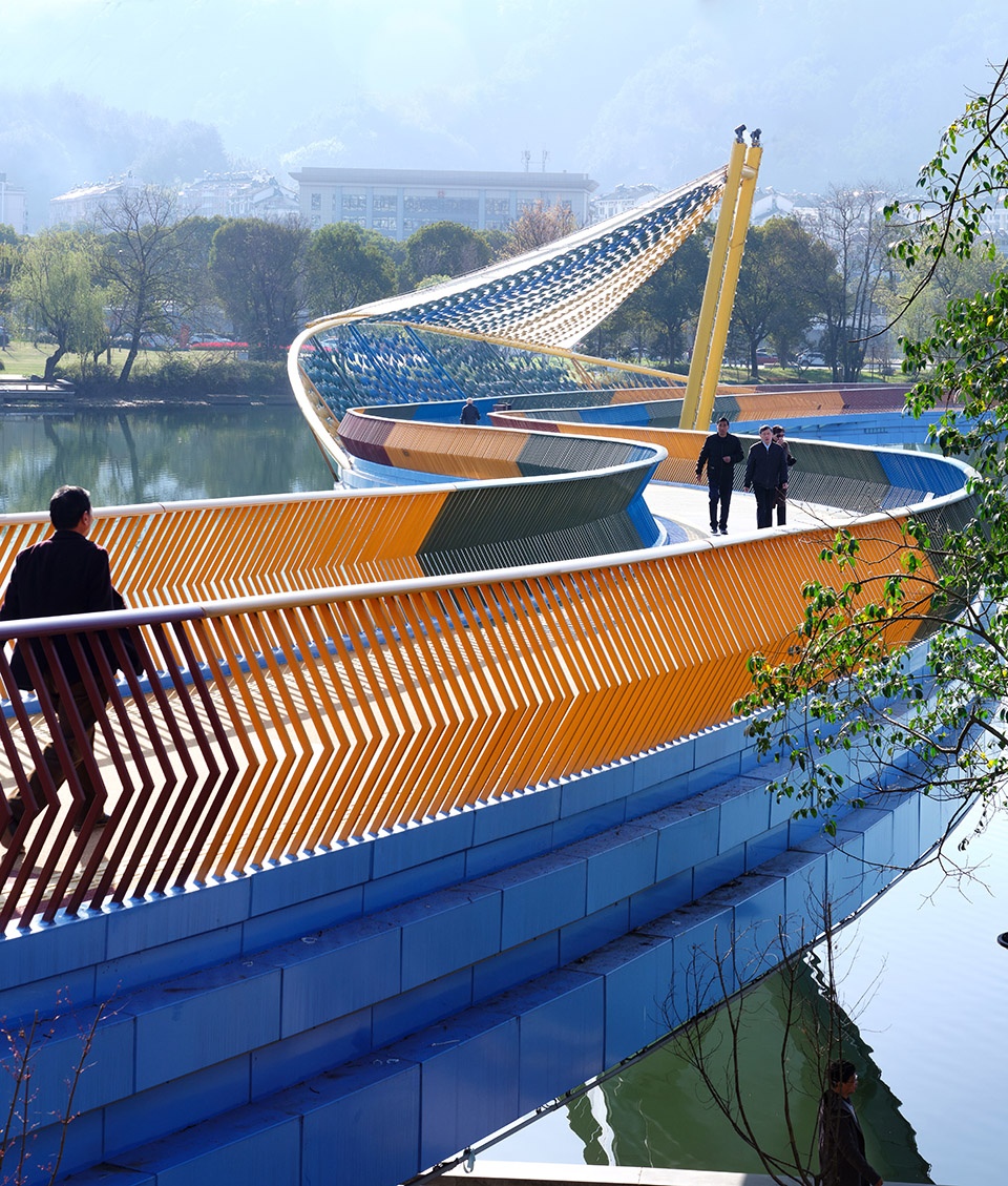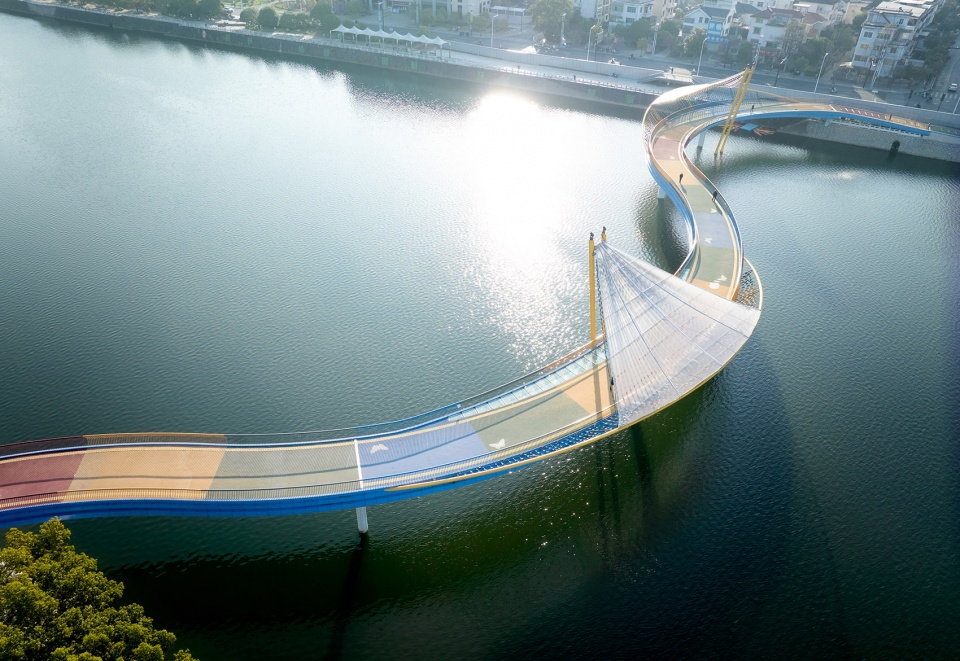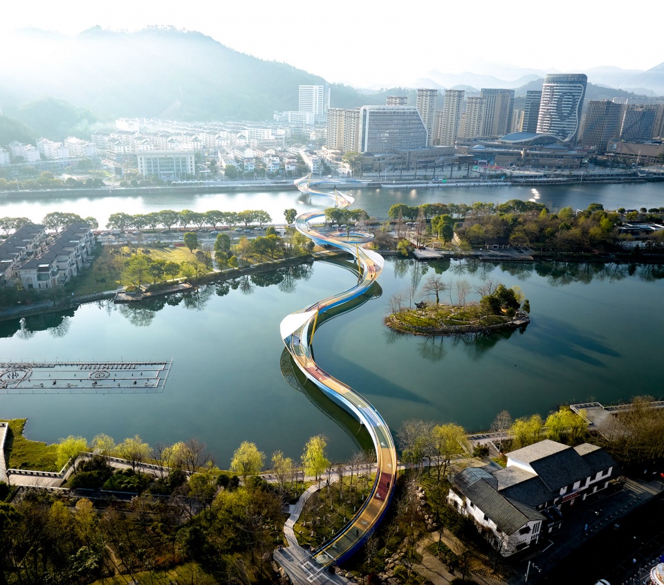 At the source of the Qiantang River, in the small county of Kaihua in western Zhejiang, where the landscape forms the backbone and culture the lifeline, a graceful pedestrian bridge, resembling a fluttering butterfly, has been conceived at the confluence of the Qin River and Nanhu Lake. The Aotan Scenic Bridge, with its sinuous curve exceeding 400 meters, spans the emerald waves, not only stitching together the new and old urban areas divided by the water, but also reconstructing the genetic code of traditional corridor bridges using a modern design language. This pedestrian bridge, which combines both transportation functions and artistic value, has become a spatial carrier for interpreting Kaihua’s ecological wisdom and cultural codes. After the completion of the bridge, the average daily foot traffic on both banks has significantly increased, and commercial vitality has been notably enhanced, which has confirmed the catalytic effect of infrastructure on urban renewal.