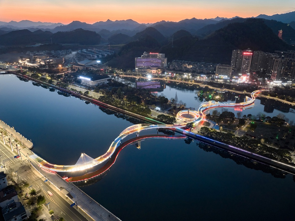 钱塘江源头,浙西小城开化县以山水为骨、人文为脉,在芹江与南湖交汇处孕育出一座翩然若蝶的景观人行桥。岙滩景观桥以超400米的蜿蜒曲线横跨碧波,既缝合被水域割裂的新老城区,又以现代设计语言重构传统廊桥基因。这座兼具交通功能与艺术价值的步行桥,成为解读开化生态智慧与文化密码的空间载体。桥梁建成后,两岸日均人流量大幅提升,商业活力明显增强,印证了基础设施对城市更新的催化效应。