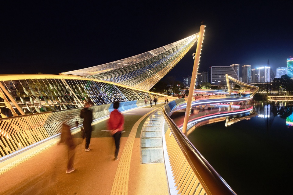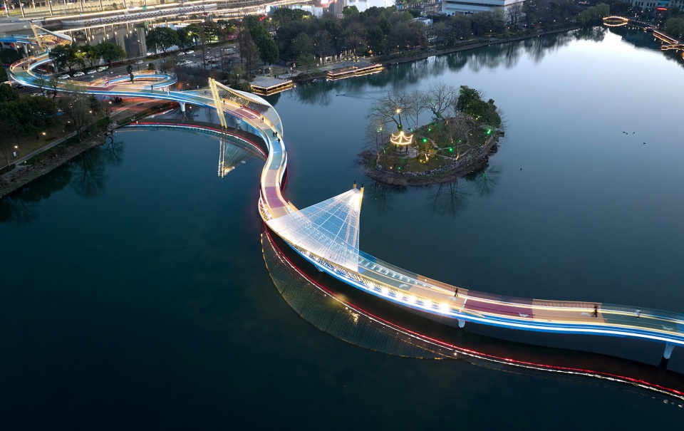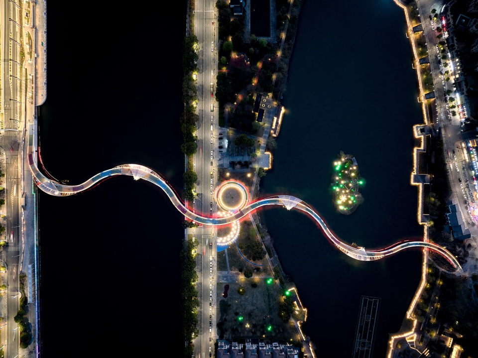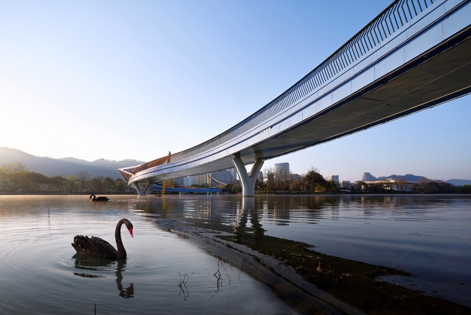 The landscape bridge, with a total span of over 400 meters, resembles an elegant and sinuous ribbon of the earth, stretching across the emerald waters. The bridge’s curvilinear design, like a dance posture changed by the gentle breeze, ingeniously integrates the beauty of nature’s agility into the form of the bridge. The bridge’s curve starts from the Nanhu Park, passes through the South Riverside Road, and ends at the city’s living room in the new district.