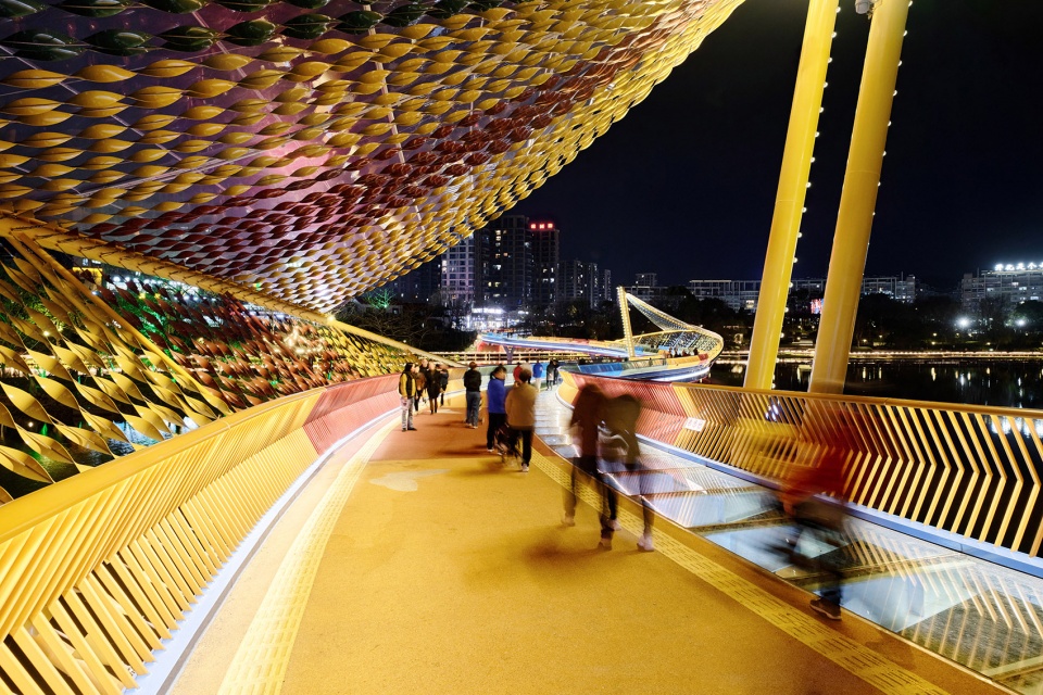 As a trigger for collective urban memory, the Aotan Scenic Bridge’s chromatic narrative has been endowed with a cultural mission that transcends its physical form. The design team, with “locality – informed shaping” as the core strategy, has transformed the city’s character into a perceptible visual language through chromatic coding. Under natural light, the bridge becomes a radiant spectacle, like a colorful butterfly dancing on the emerald waves, offering a delightful visual feast. This color translation based on the place’s genetic makeup awakens among citizens a deep – seated emotional resonance with waterfront life and enhances the city’s cultural distinctiveness.