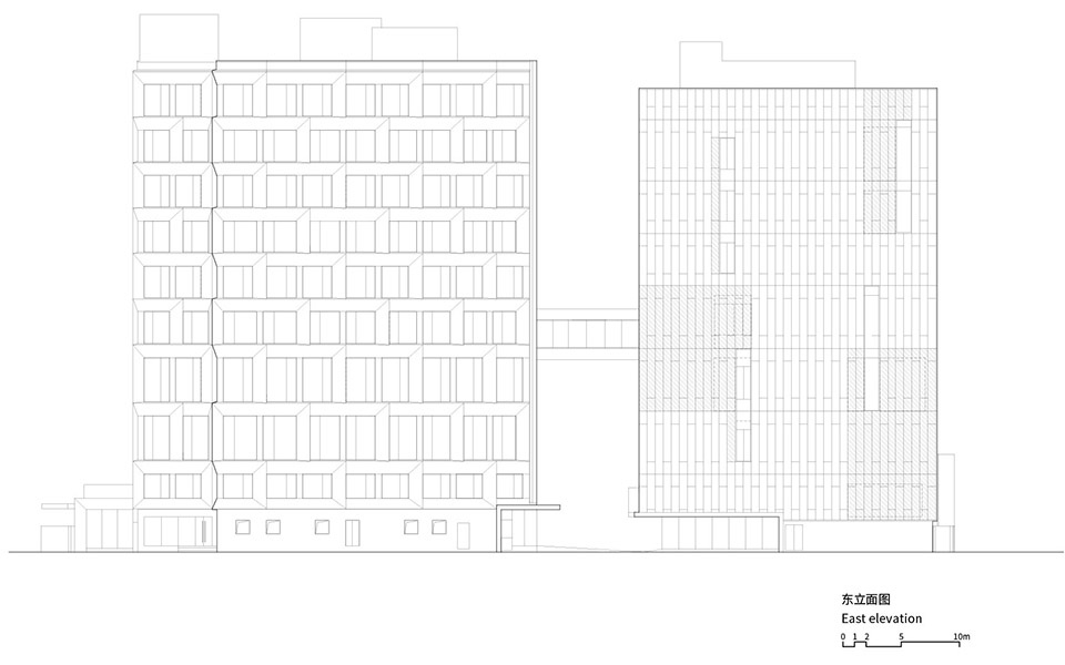 内院立面构造则在保留现有格局的基础上进行了细节优化。采用了节约造价的玻璃窗和金属饰面,以简约的手法确保建筑各立面风格一致。同时,也为内院中的主体车库设计了轻巧、雅致的外观镂空金属装饰幕墙表皮。