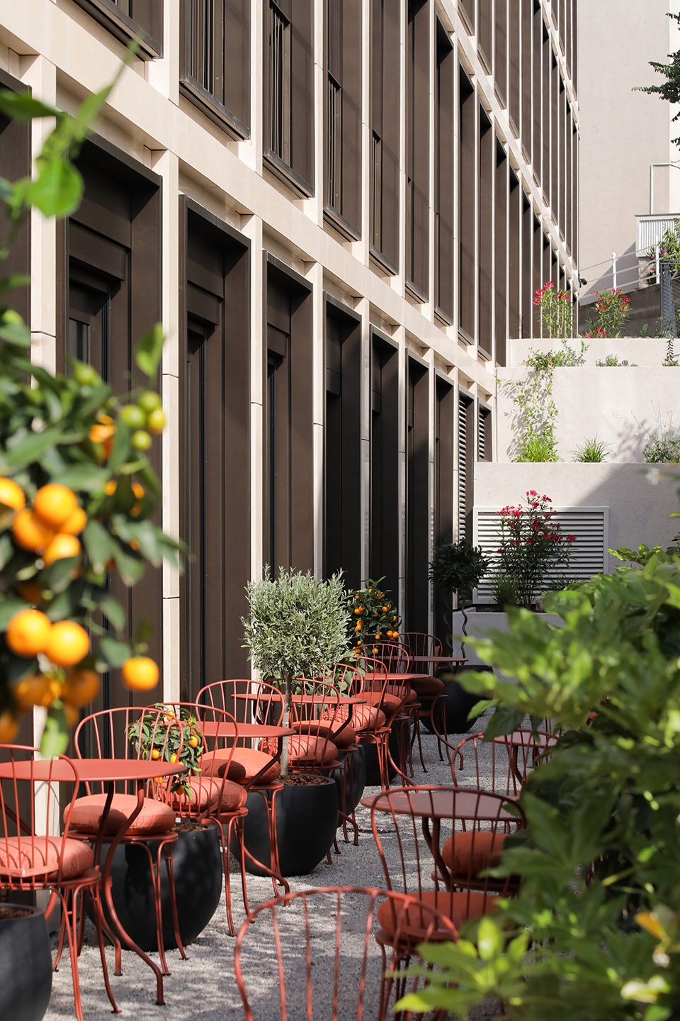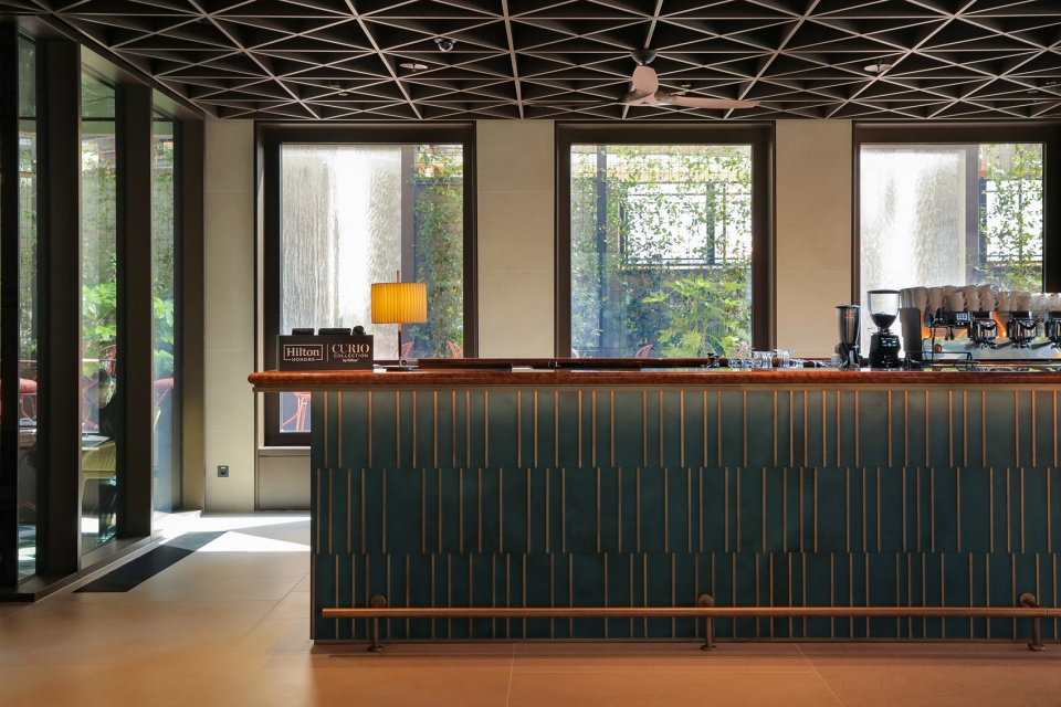 酒店的外立面采用规则的网格结构,由玻璃幕墙与水平(楼层间)结构元素及垂直立面结构元素相结合。此外,外立面选用低调的色调和肌理,与奥帕提亚历史建筑的保护环境和氛围相契合,使酒店呈现出清晰的古典主义形态,不仅与周边环境和建筑功能相适应,同时也丰富了城市空间的视觉形象。