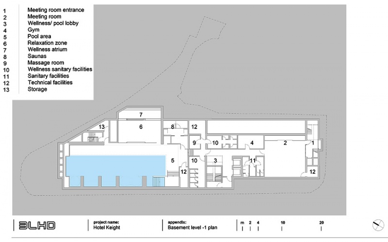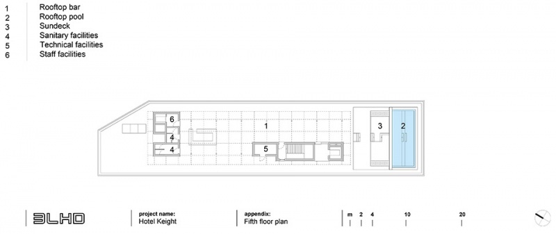 A bar, a swimming pool and a sun deck are located on the roof. Bright and light tones represent a kind of escape into the dream world. On the lower deck, the basement of the hotel, there are wellness facilities.