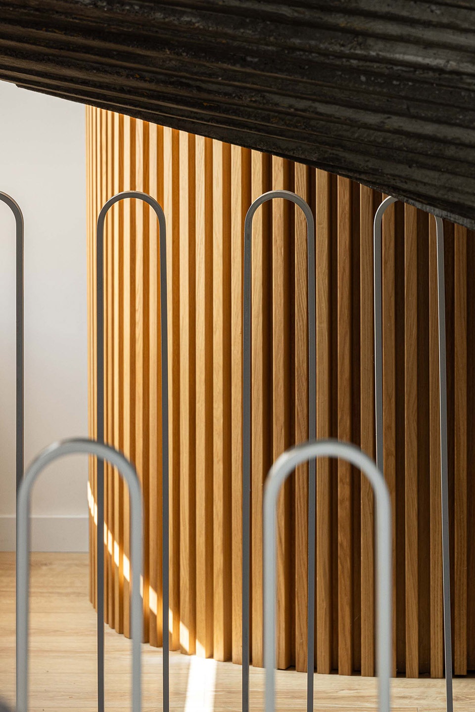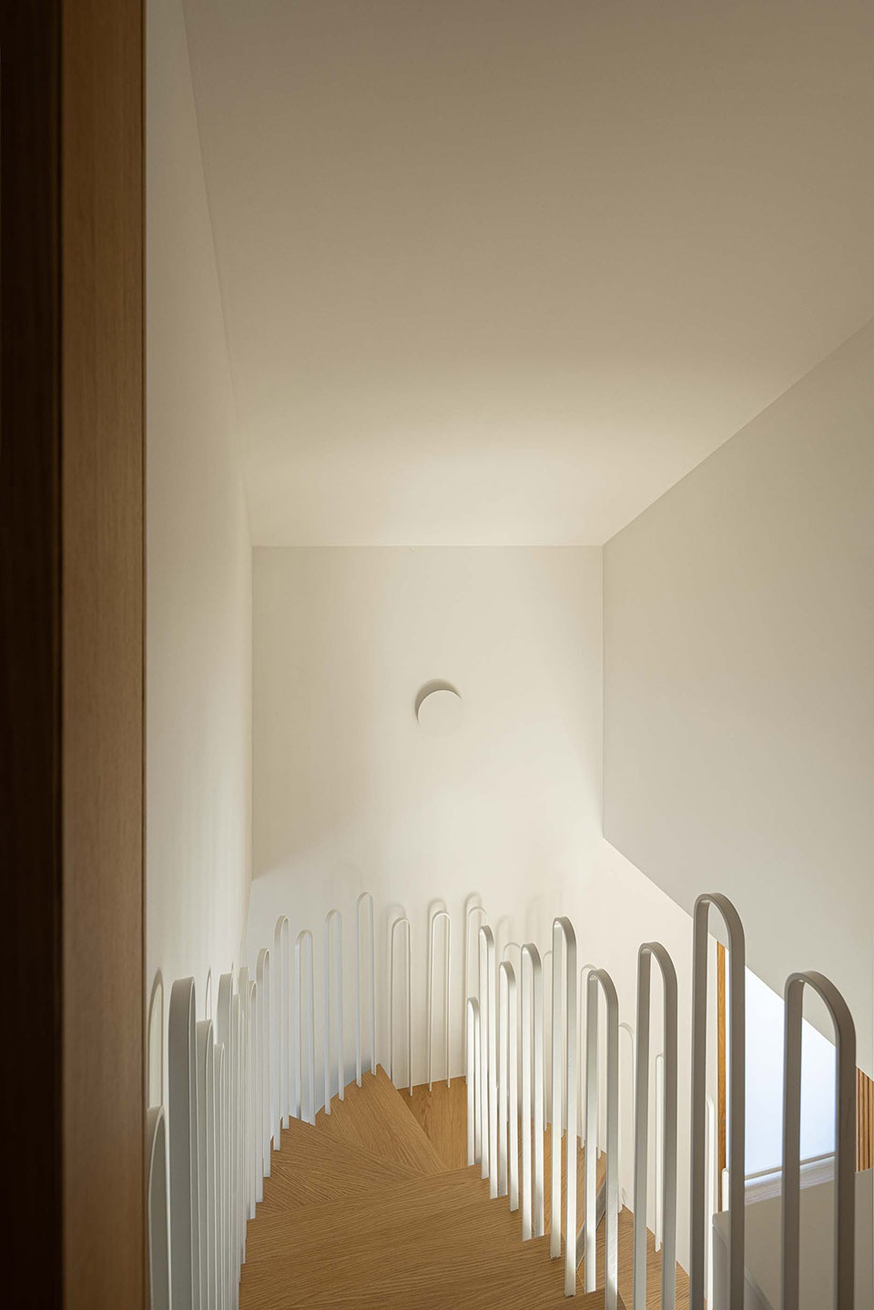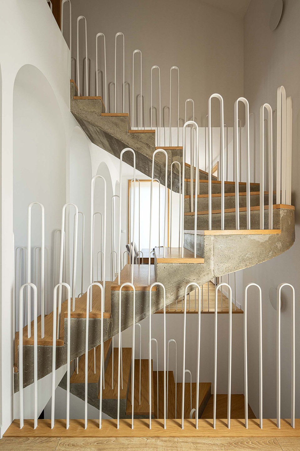 楼层间的连接通过一座混凝土楼梯实现,楼梯表面覆以木材,使其成为既悬浮又富有装饰感的元素,完美契合拱形框架的节奏感。这座楼梯的起点和终点都嵌入在拱形结构之中,使得“拱”不仅仅是一个装饰元素,更成为组织空间的核心逻辑。拱不仅定义了室内空间的布局,还成为建筑外部的标志性元素,特别是在入口处的设计,使其成为具有纪念意义的空间装置。这一设计完美回应了业主在谈论“新艺术”风格时反复提及的梦想。