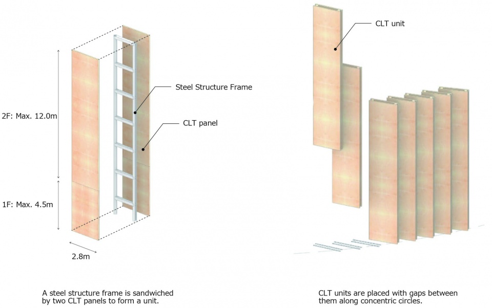 展馆采用最大约3m×12m的CLT沿建筑圆周方向呈雁行布置,以方形板构成圆形建筑。为了突出大规格(日本产CLT的制造极限)面材直接构成的简单结构,采用钢框架骨架,并用2张CLT从内外两侧夹住墙体骨架,以象征性地展示CLT。