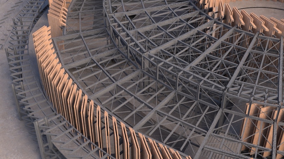 These walls are meticulously arranged in a staggered formation, alternating their orientation in each concentric zone. This configuration addresses a critical structural challenge unique to this building, wherein discontinuities in the floor plates (horizontal structural surface elements) occur due to the exhibition layout. Concurrently, it ensures adequate torsional rigidity throughout each zone of the circular plan. These CLT structural walls fulfill several functions: 1) Delineating the spatial divisions within the exhibition space, 2) Forming both interior and exterior walls of the building, and 3) Functioning as seismic-resistant elements. The aim of integrating the exhibition design, architectural design, and structural performance into a unified system has been achieved.