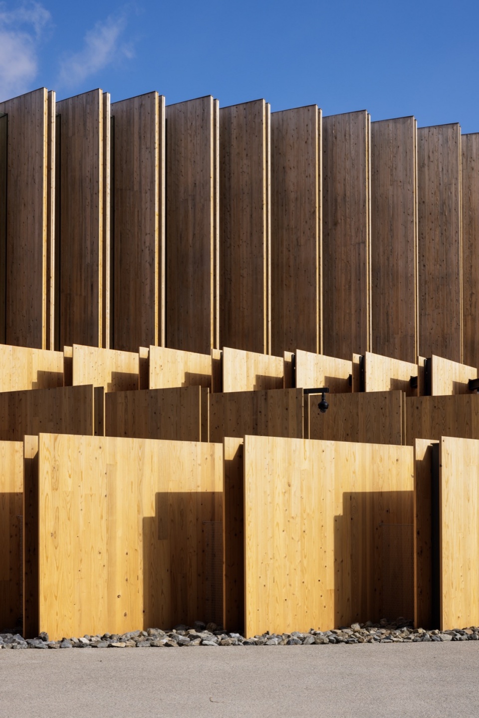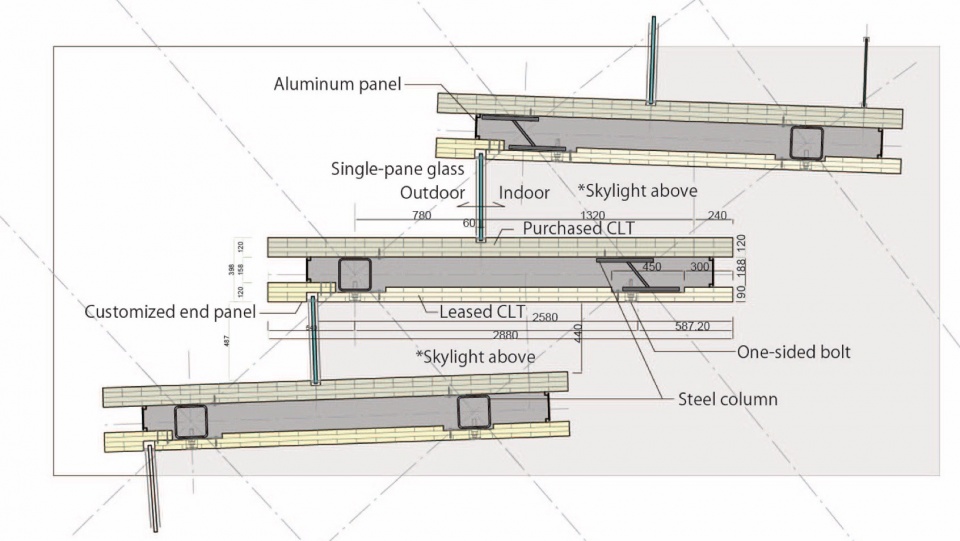 Structural testing was conducted to verify the strength and rigidity of the joints, as well as to assess the ease of construction and disassembly using test mock-ups. The CLT panels are configured with 3-ply (3 layers) for the interior and, adding an extra ply for protection with 4-ply (4 layers) for the exterior. Slits are fabricated in the protection ply to allow for the direct insertion of glass, creating a straightforward yet expressive façade that highlights the presence of the CLT panels. In total, approximately 1,600 cubic meters of CLT is used.