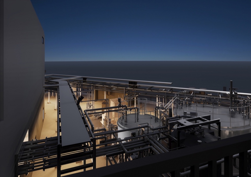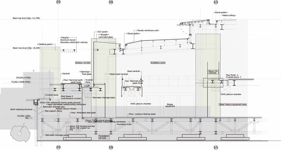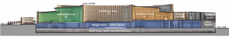 作为象征性展示生命循环的展览的一环,建筑中安装了生物气体设备。通过回收世博会场产生的厨余垃圾,利用微生物发酵分解产生的生物气体,在展馆区域内发电。展览空间提升到2层,1层则规划为设备区。二者在断面上明确分离,通过挑空空间展示运转中的机器设备作为展览的一环,形成可立体观展的展览空间。
