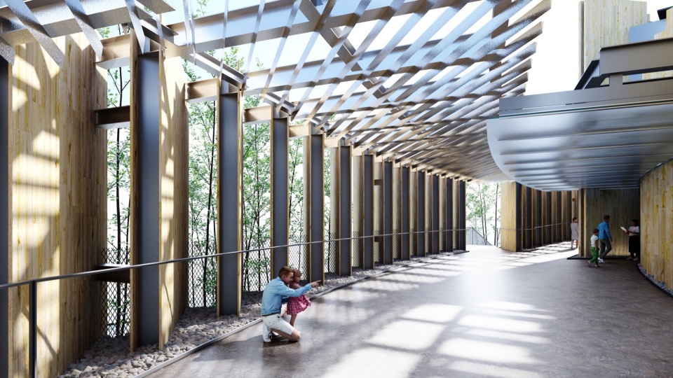 A gentle sloping outdoor corridor encircles the second-floor exhibition, ensuring individuals with disabilities have a barrier-free access and route. This universal design approach ensures equal participation and shared experiences for all. The outdoor corridor functions as an access route to three exhibition areas and as an emergency route, designed to safely evacuate individuals with disabilities. To enhance the pavilion’s accessibility, workshops were conducted with experts from various fields, and their feedback was incorporated into the planning, including considerations such as slope gradients, material textures, and color contrasts.