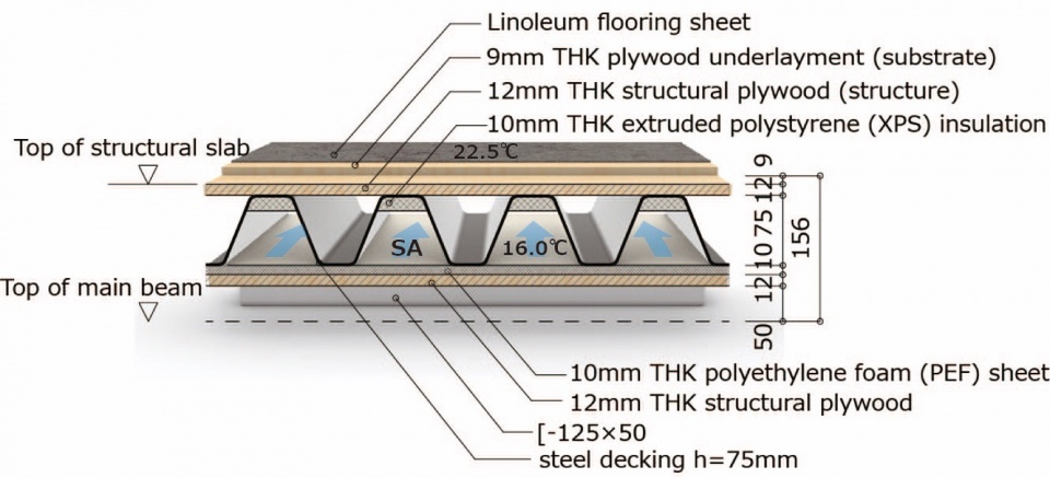 The design of the pavilion, given its temporary nature, exposes the CLT panels on both the exterior and interior, creating a distinctive architectural expression. Addressing structural integrity and weather resistance measures, the basic configuration of the CLT panels was a 3-ply (three layers) for the interior panel and a 4-ply (3 layers) for the exterior. To mitigate the low bearing capacity of the reclaimed ground, floors of the exhibition spaces employ a dry composite floor system, combining structural plywood and corrugated floor decking with screws. This system improves walking comfort while enabling floor installation in the early stage of construction. To facilitate disassembly after the exhibition, the floor decking sheets are affixed to the steel beams using tapping or drilling screws, eliminating the need for welding and ensuring a fully dry construction. Full-scale testing was conducted to verify walking comfort and vibration performance.