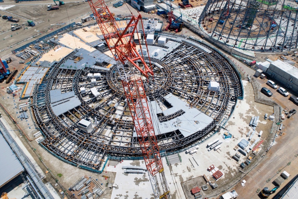 ▼呈同心圆状展开的基础桁架(现场照片),Concentric formation of the foundation truss under construction (site photo)