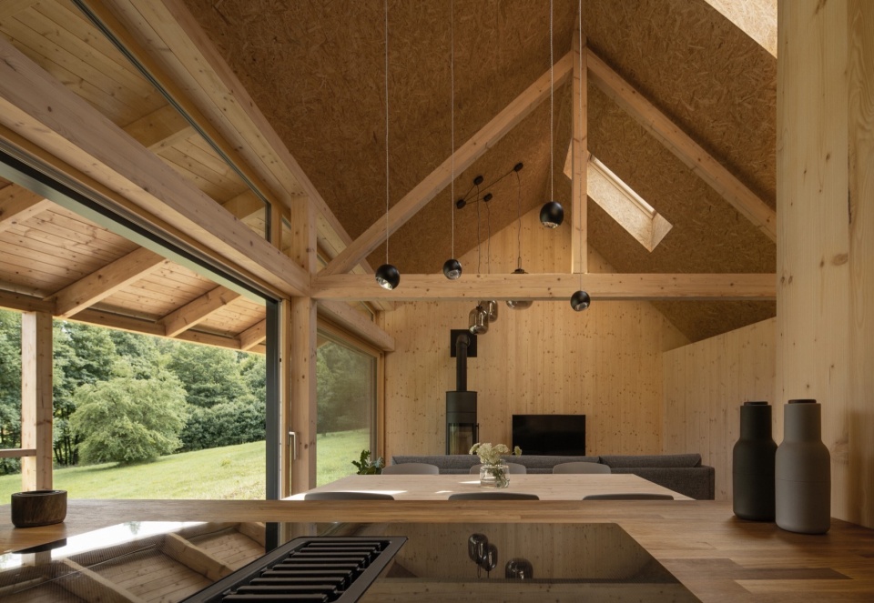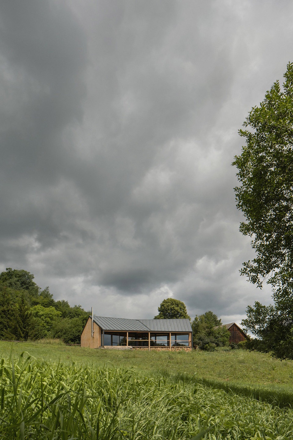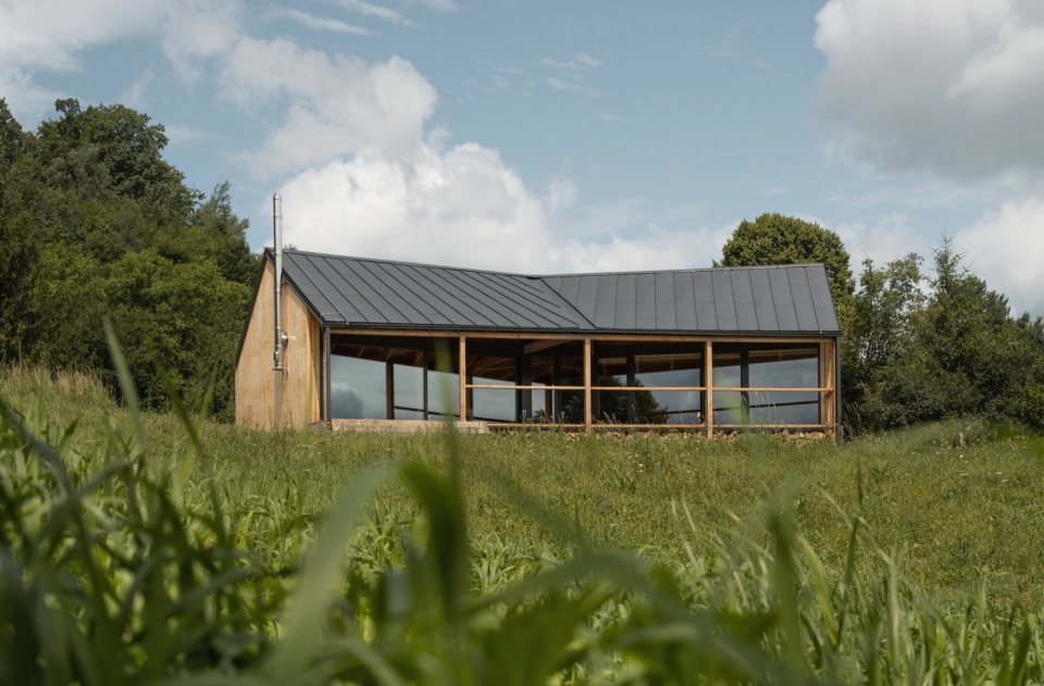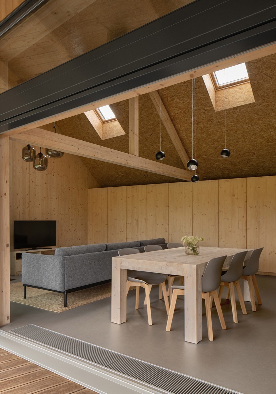 建筑结构采用CLT木板作为主体材料,并以木制桁架支撑屋顶。地下室承担设备和储藏功能,由混凝土块砌筑,并在外露部分覆以当地石材,使建筑与斜坡地形自然融合。屋顶则采用深色金属板以对角铺设,既保证耐久性,又呈现朴实的乡村美学。