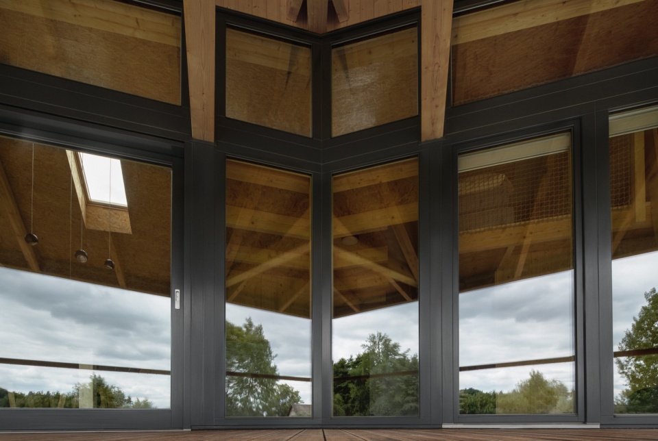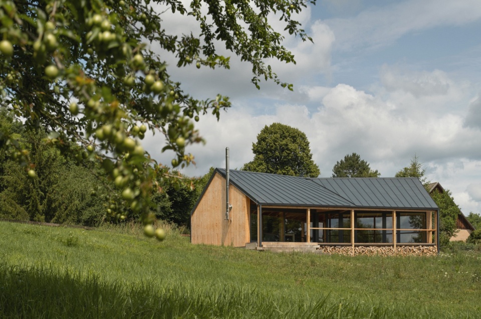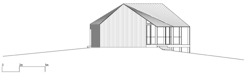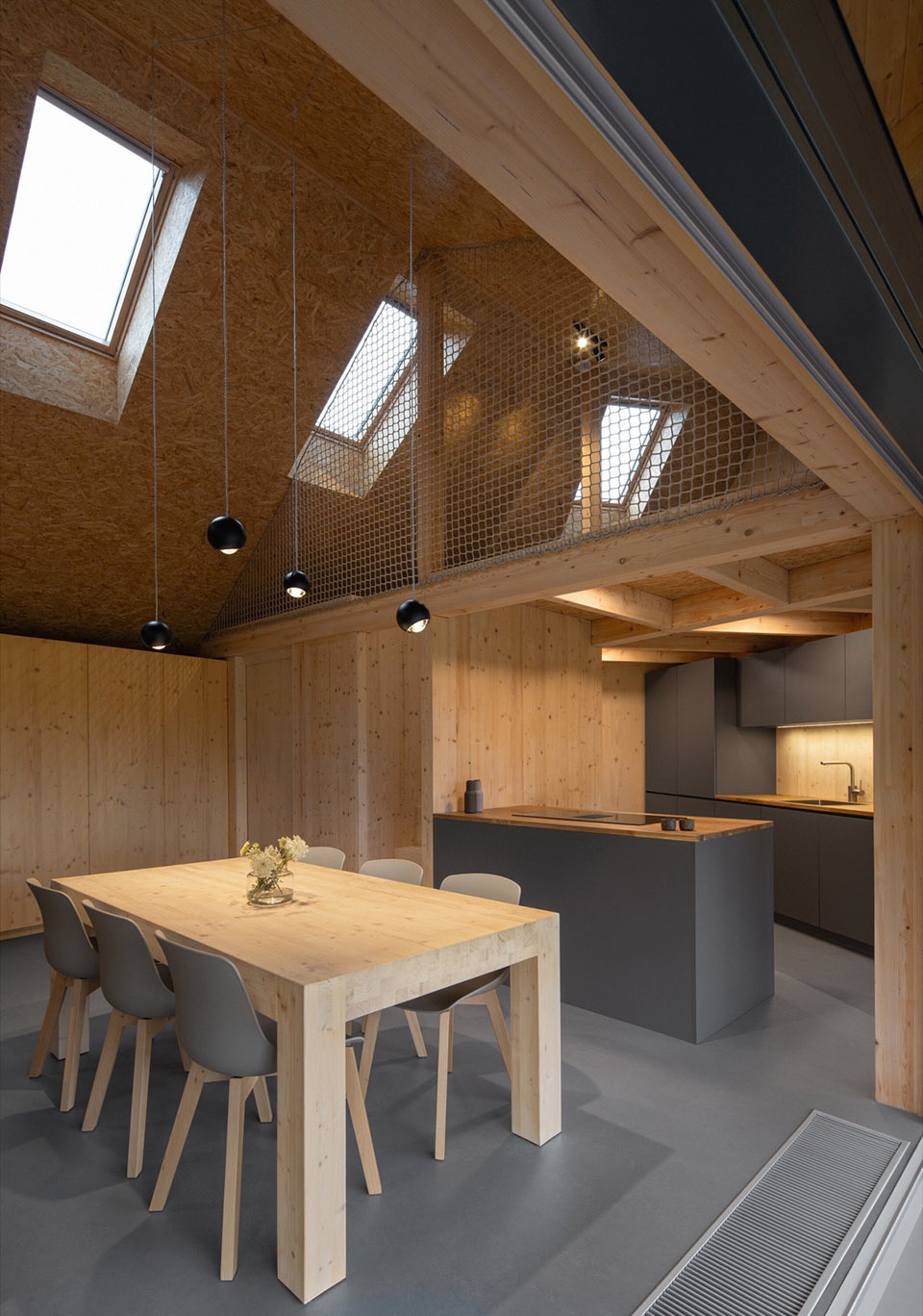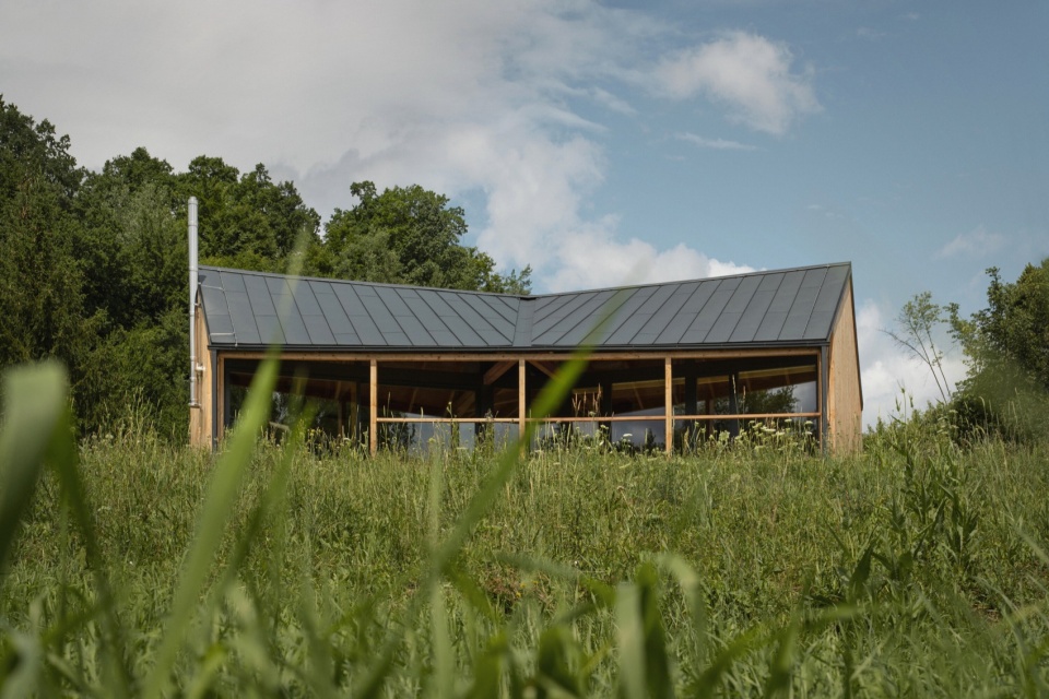 建筑结构采用CLT木板作为主体材料,并以木制桁架支撑屋顶。地下室承担设备和储藏功能,由混凝土块砌筑,并在外露部分覆以当地石材,使建筑与斜坡地形自然融合。屋顶则采用深色金属板以对角铺设,既保证耐久性,又呈现朴实的乡村美学。