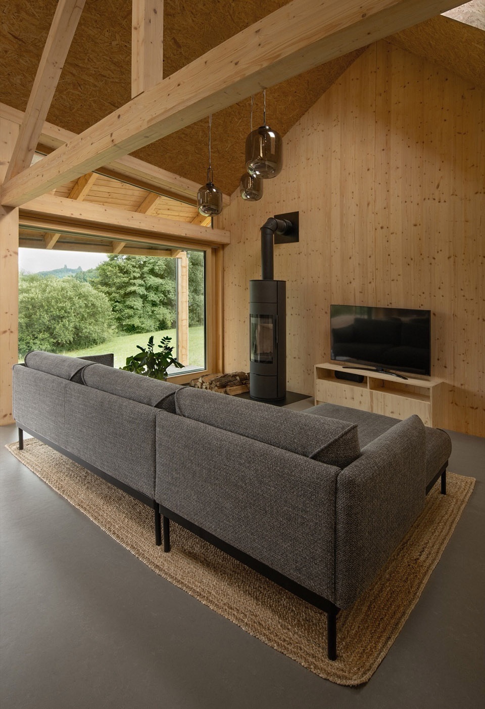 Upon entering from the northern access road, one is greeted by an expansive view of the south-facing panorama, framed by the ruins of medieval castle Trosky. The living spaces, including a main living room with an inserted floor, a children’s room, and a bedroom, are oriented towards this breathtaking view. A terrace extends these living areas into the landscape, creating a seamless indoor-outdoor experience.