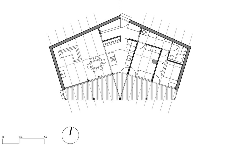 住宅的平面呈宽展的V形,这一设计回应了狭长地块的形态,同时最大化地利用了面向波西米亚天堂的壮丽景色。建筑为单层结构,采用双坡屋顶,呼应该地区的建筑传统,而纵向折曲的建筑体量则赋予其现代感。