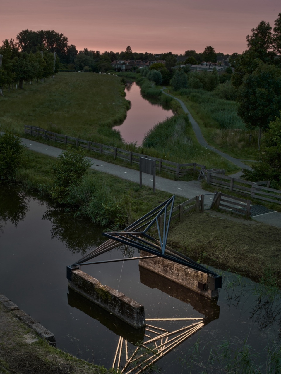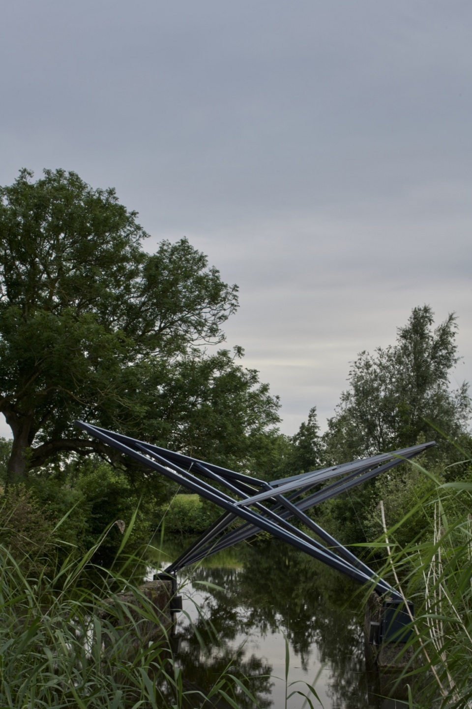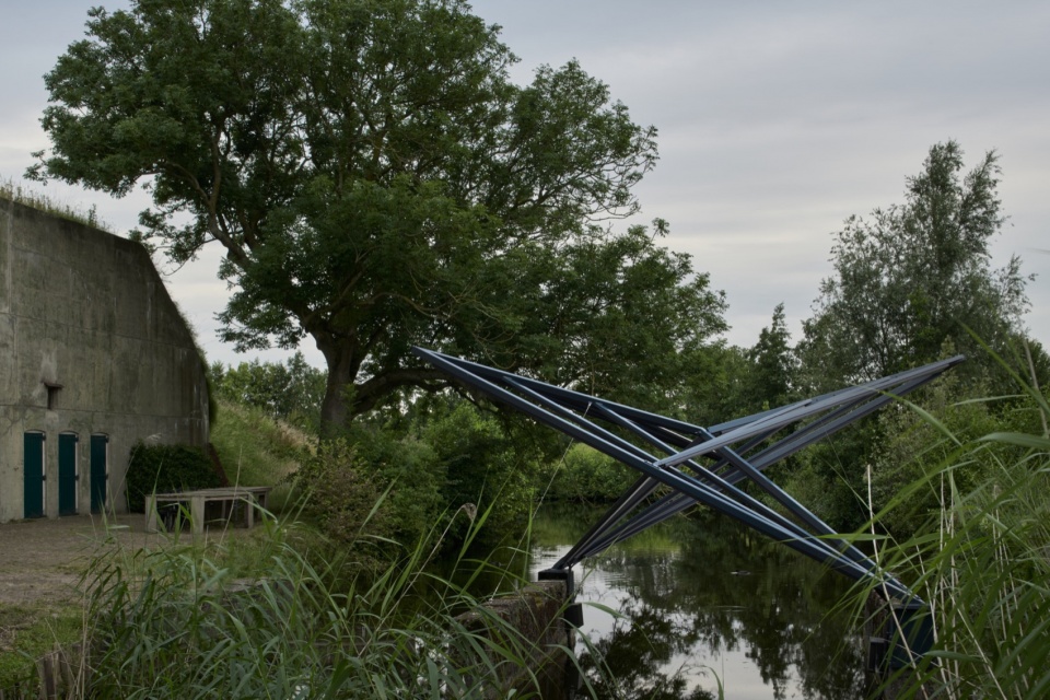 Originally constructed in 1904 as part of the Defence Line of Amsterdam, the fort has since evolved into a vibrant cultural hub within the Haarlemmermeer region. The imposing, elongated structure of the fort contrasts beautifully with the Syndesmos sculpture, which features a porous, upward-reaching steel framework that rises above the surrounding reeds. Standing at three meters high and spanning six meters across, Syndesmos commands attention and engages in a visual dialogue with the massive concrete fort.