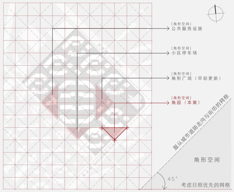 ▼寿二小区整体空间布局呈现90°与45°两个格网互动的秩序关系,The overall spatial layout presents an orderly relationship of interaction between two grids of 90° and 45°