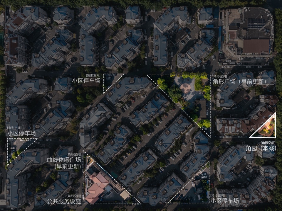 寿二小区的建筑布局是“正南北采光最优导致的生活体验合理性”与“倾斜的矩形用地街坊引发的空间聚落合理性”两个因素互动的产物,最终形成了以“90°”与“45°”两个方向空间约束的院落式的小区建筑聚落。这样的布局特征也自然在住宅占地以外形成了一系列的“角形”空间,这些空间目前的使用功能主要是:地面停车、小区公服设施、小区集中绿地、小广场、宅间绿地等。而本次设计的角园在更新前也是寿二小区内的一处“角形”宅间绿地,于是“角园”作为这个社区花园的名称也算是自然而然的。