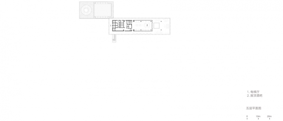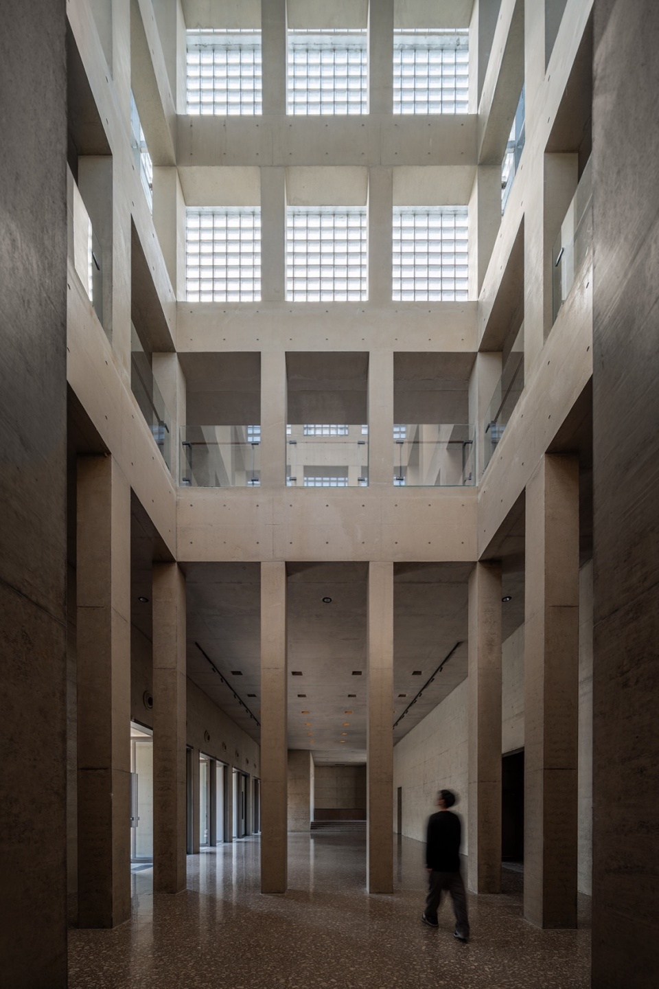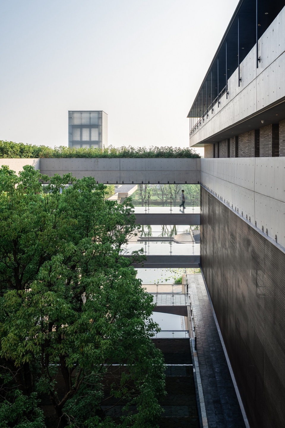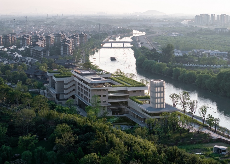 砖墙体量上方的水平檐口从竺山向运河一侧逐级叠落,端头朝向河口处立有一座玻璃光塔。这些微妙的动作最终结合在垂直方向上的漫游步道和体量开合,呈现出一个空间的立体游走系统。