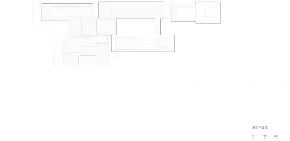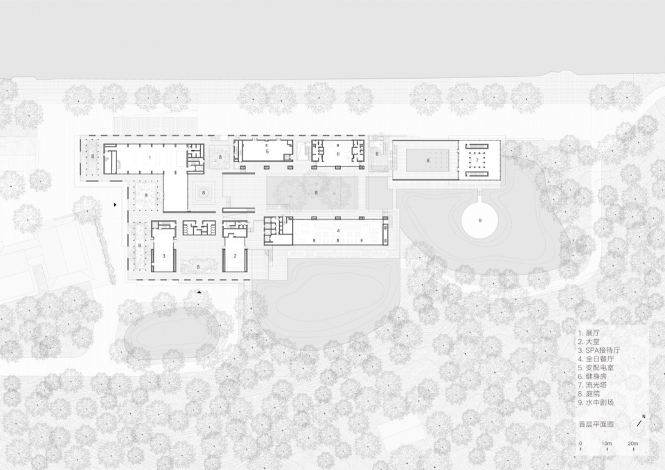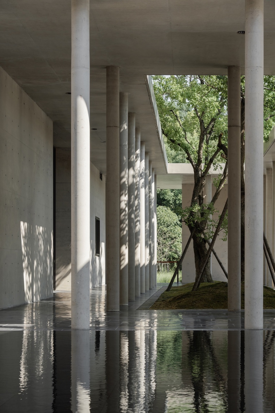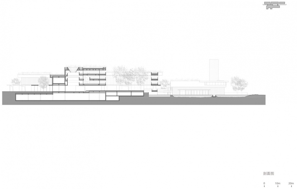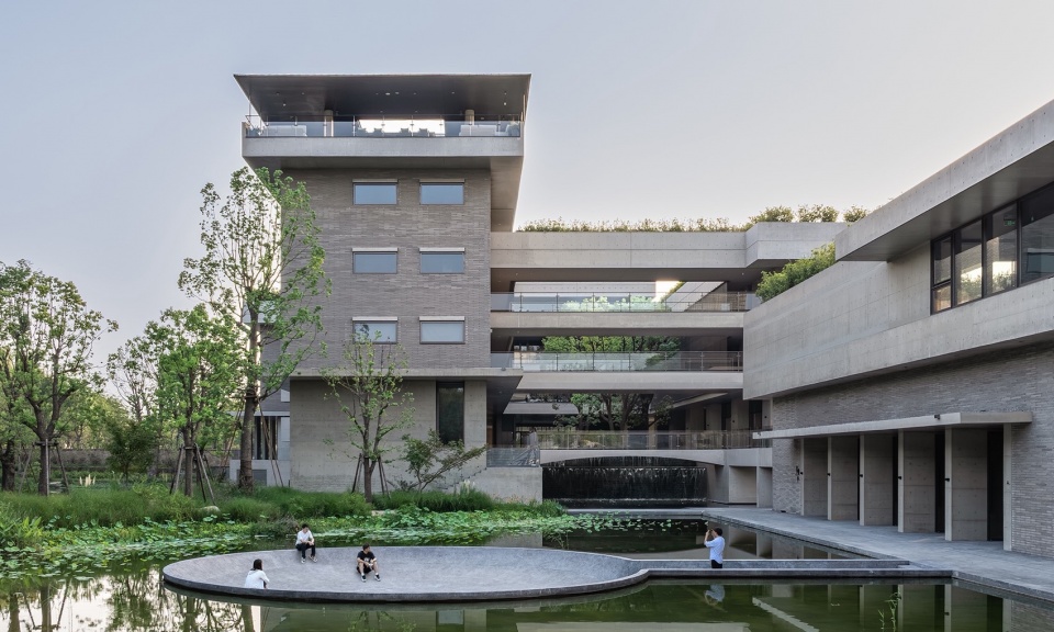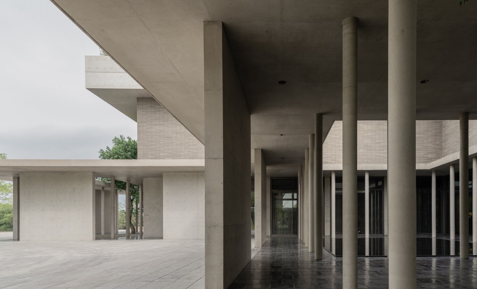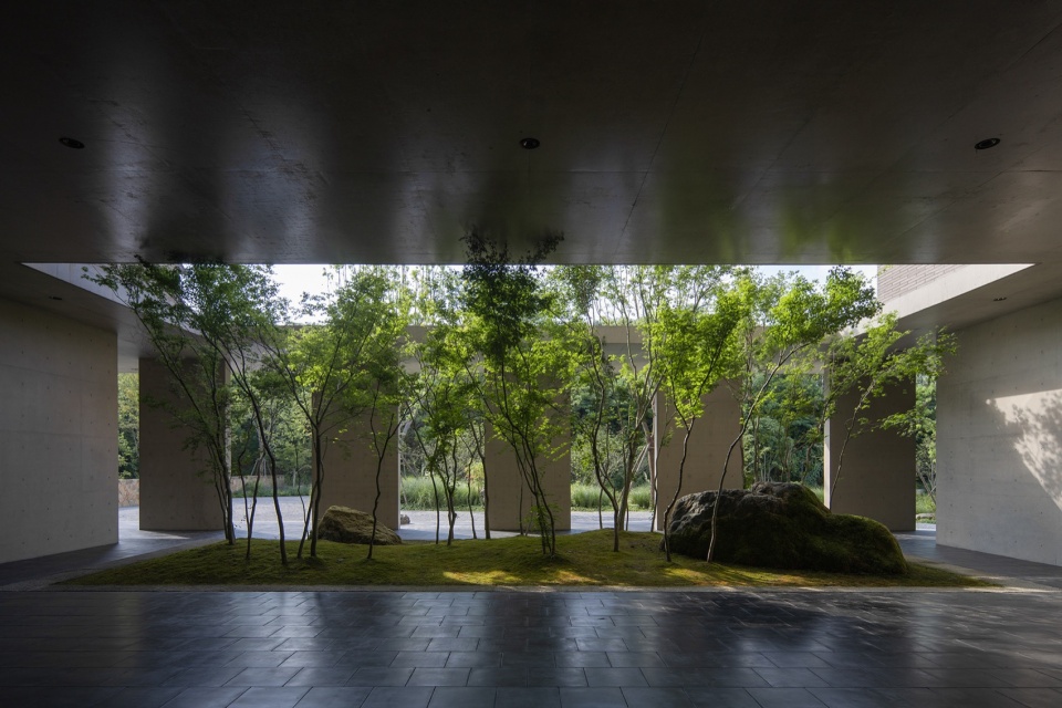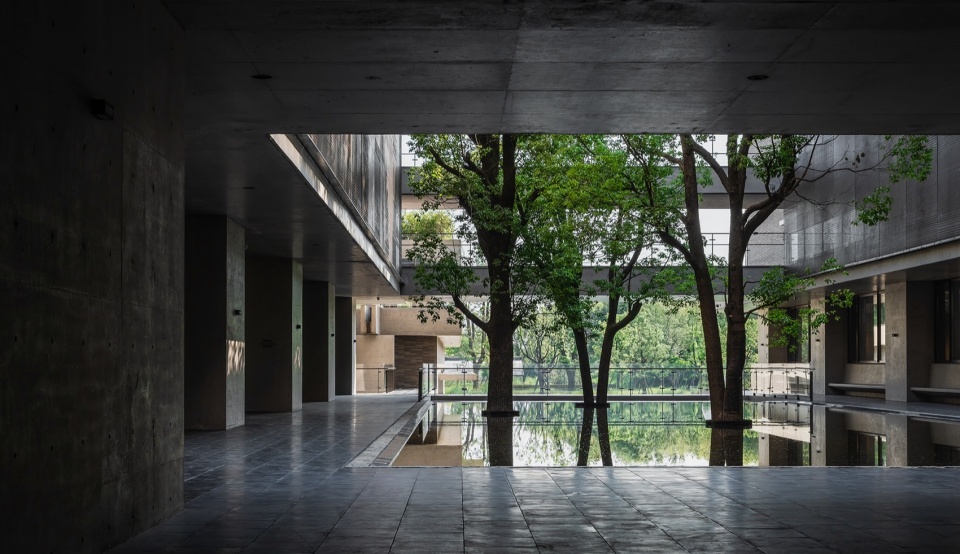 建筑底层的室外游廊系统一共串联着九个院子,由西向东延伸,根据氛围对应不同的自然主题,构成群院格局中多个带有鲜明特征的节点。地面标高顺应原始地形,由西向东下沉,最终嵌入山脚的水塘,形成半层高差的微地形。