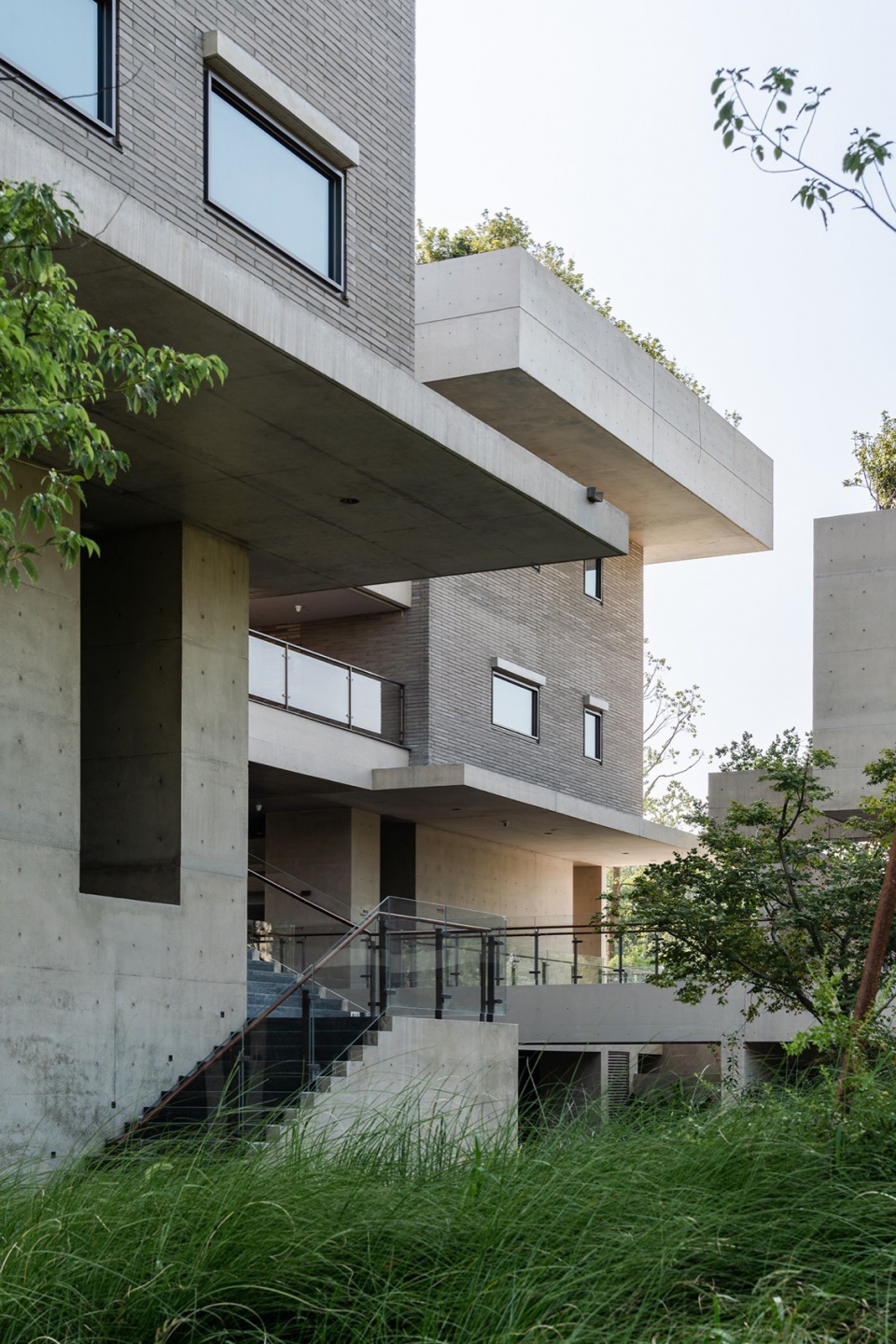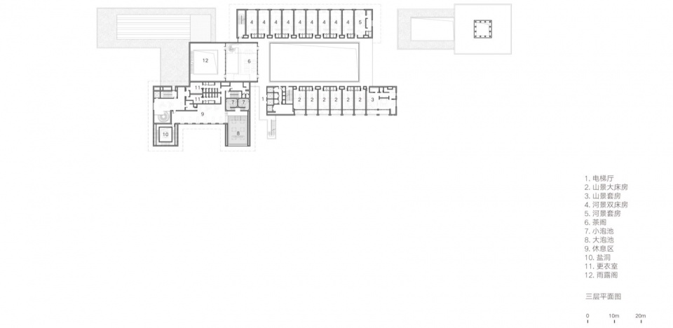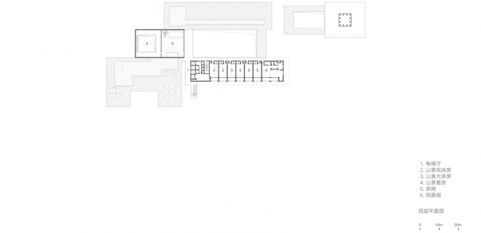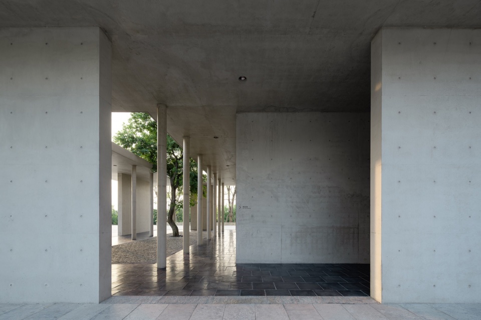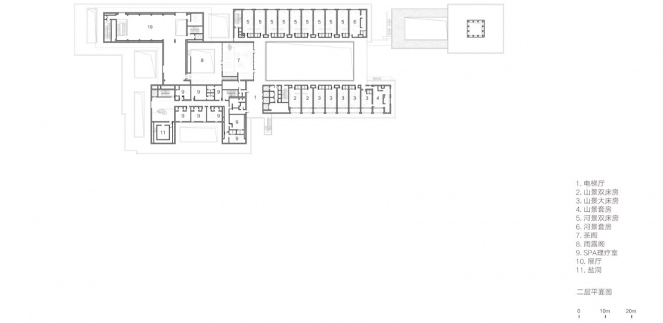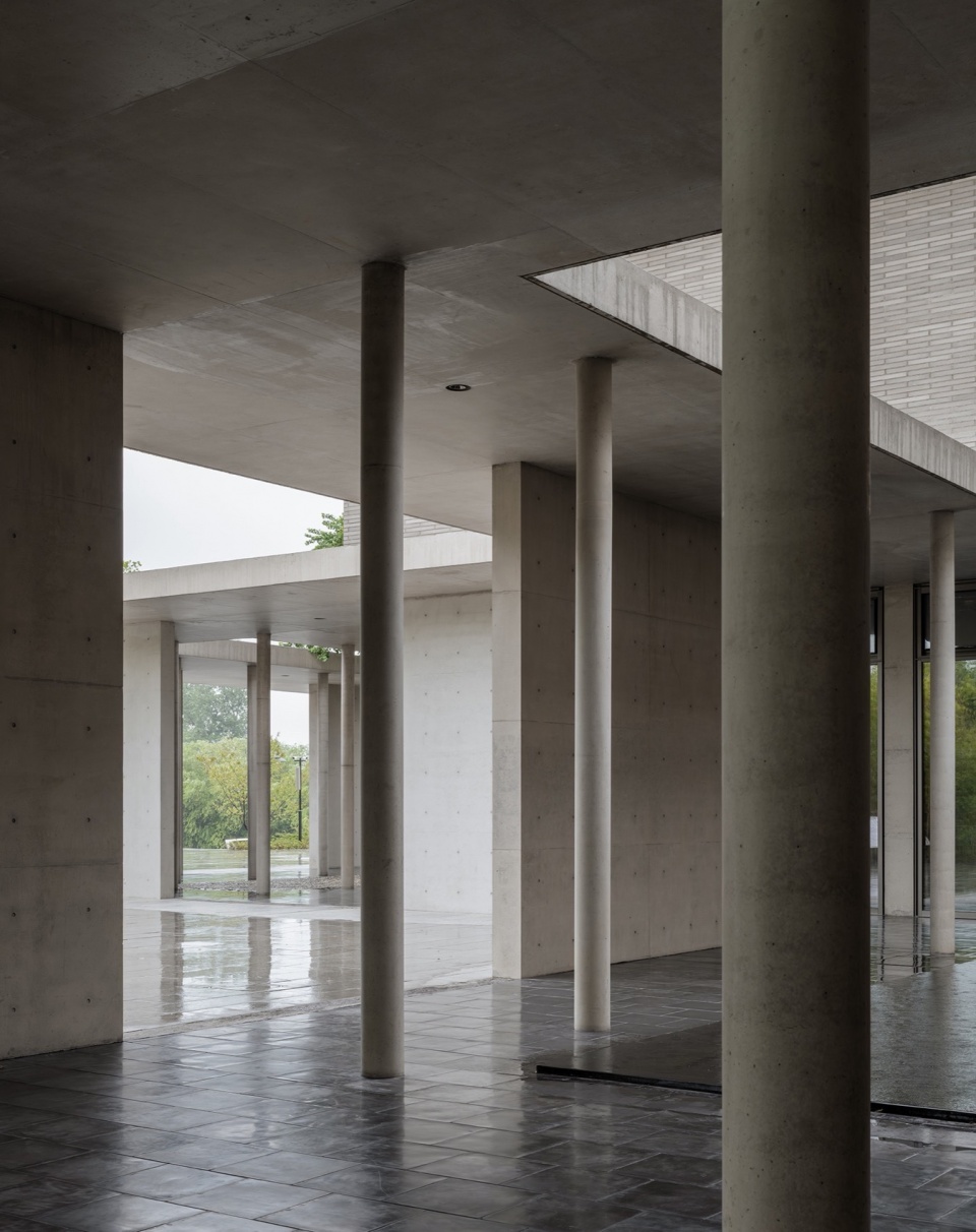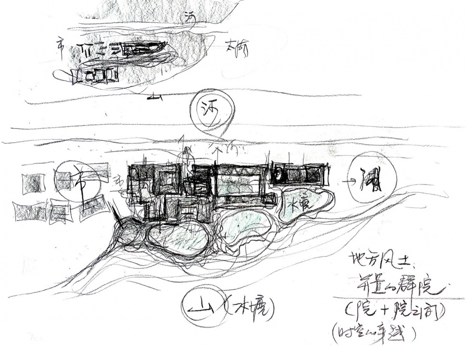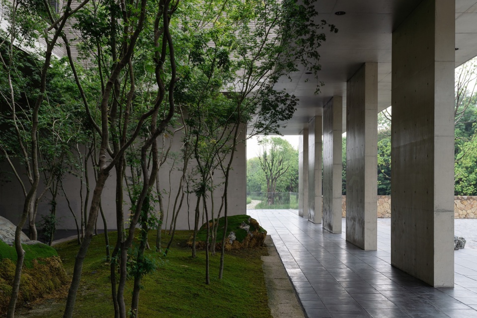 建筑底层的室外游廊系统一共串联着九个院子,由西向东延伸,根据氛围对应不同的自然主题,构成群院格局中多个带有鲜明特征的节点。地面标高顺应原始地形,由西向东下沉,最终嵌入山脚的水塘,形成半层高差的微地形。