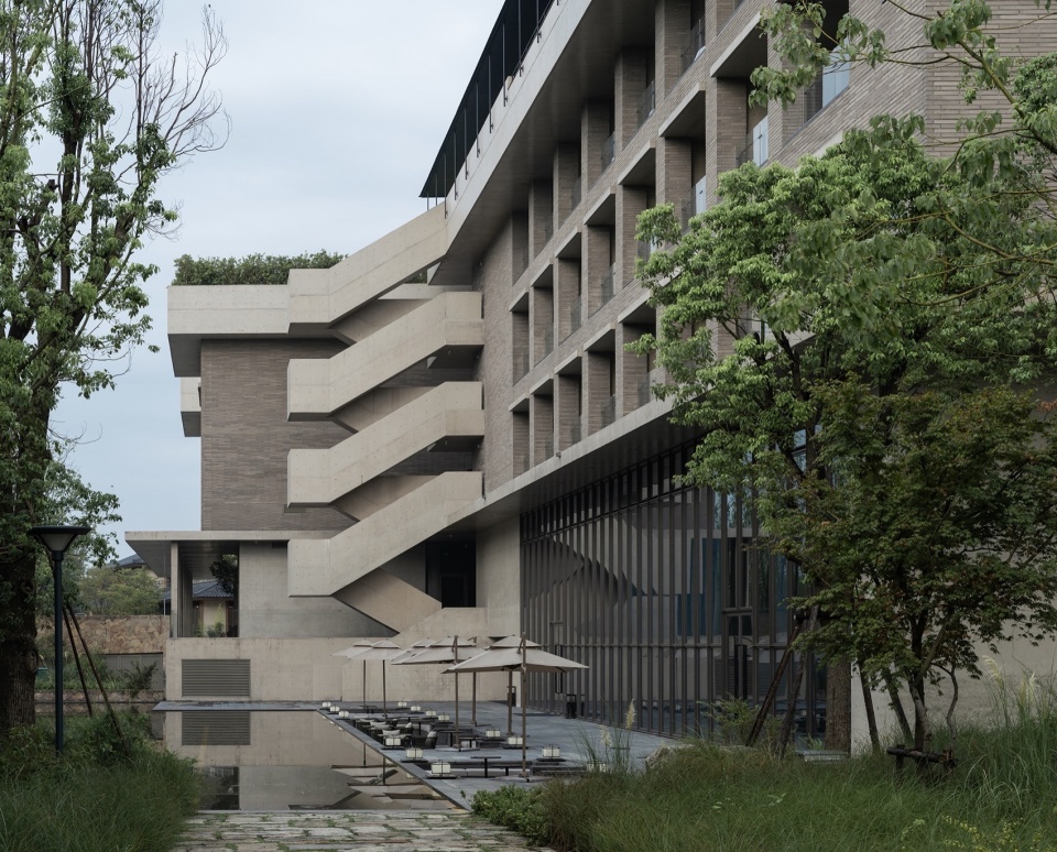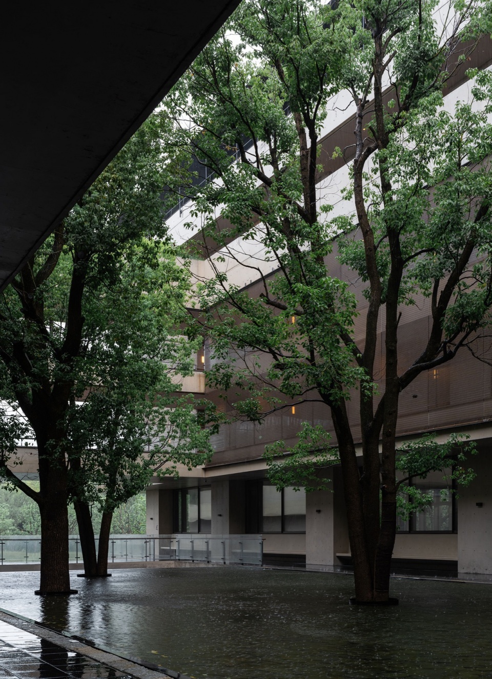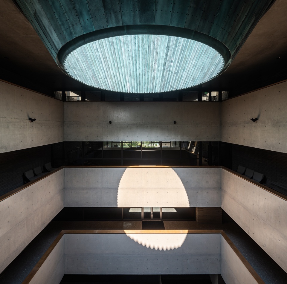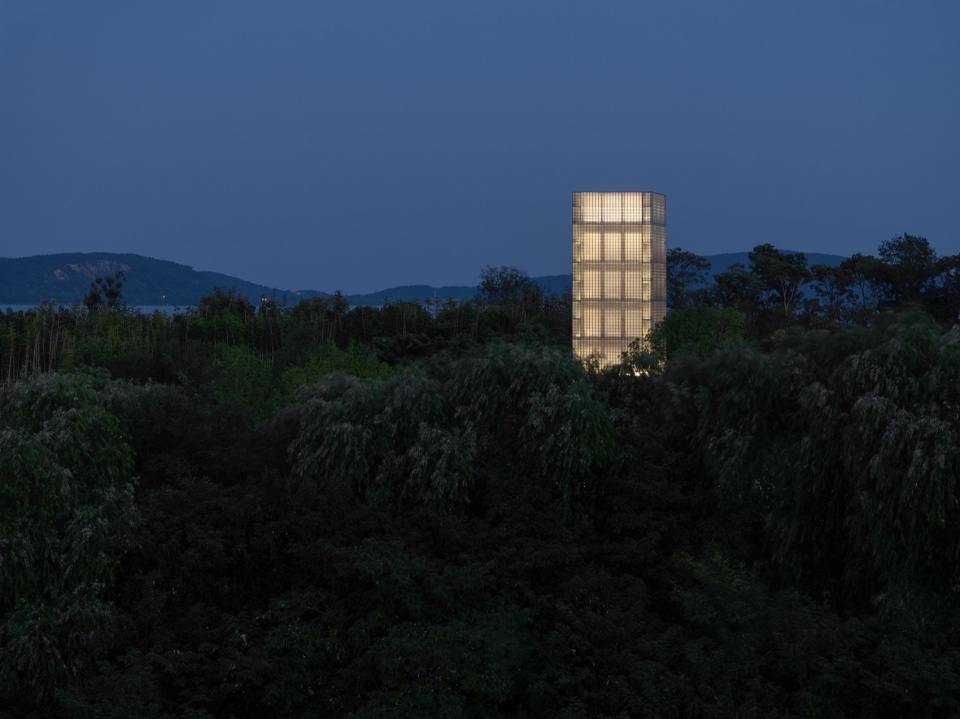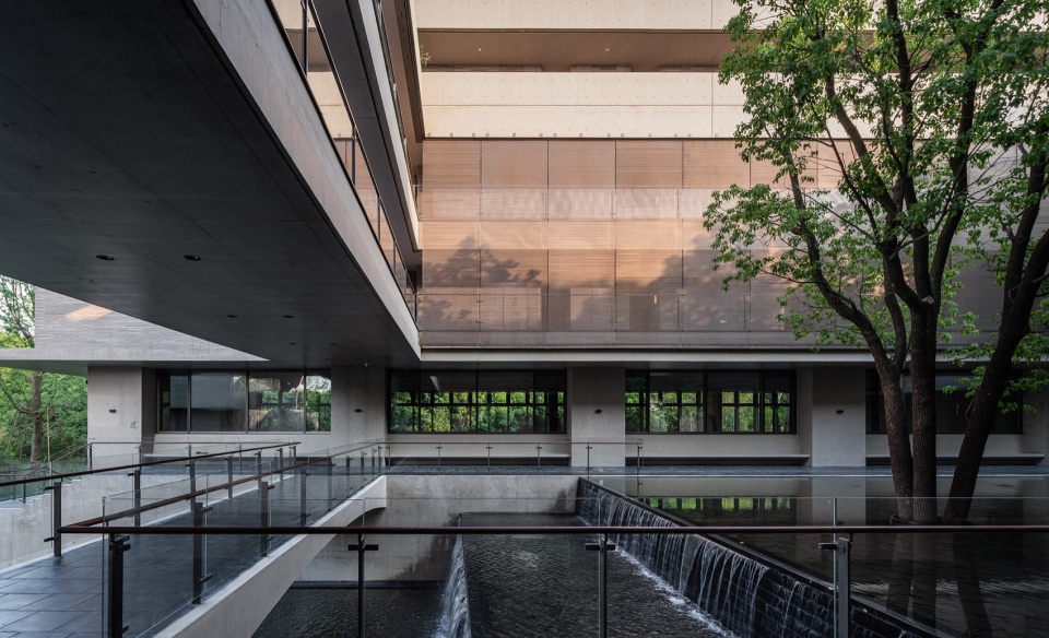雨露阁作为整个建筑群的空间枢纽与多个院子相接,圆形青铜雨斗被放置于高16米的空间顶部,作为屋檐汇集疏导雨水。樟树水院尺度最大,东侧朝太湖方向敞开,南北两侧由两层通高铜网包裹的客房走道环绕界定。河岸边高耸的光塔呼应太湖之水,塔顶高24米,通体采用玻璃砖砌筑而成,映射着天光的变化。