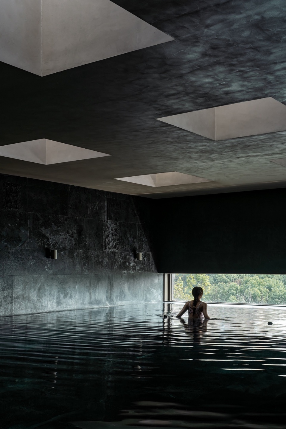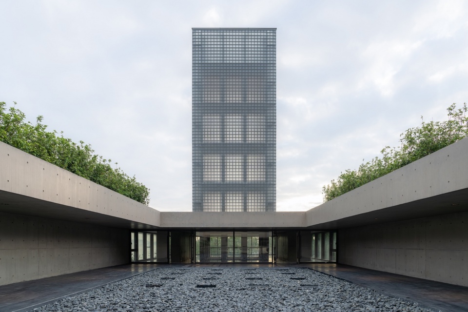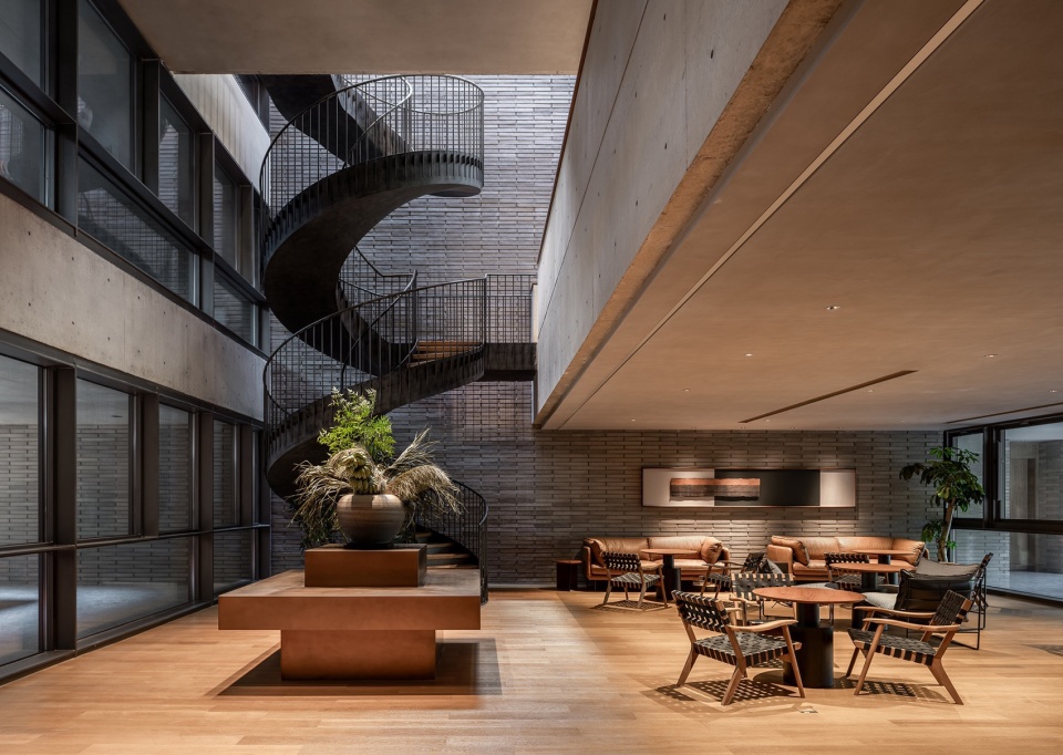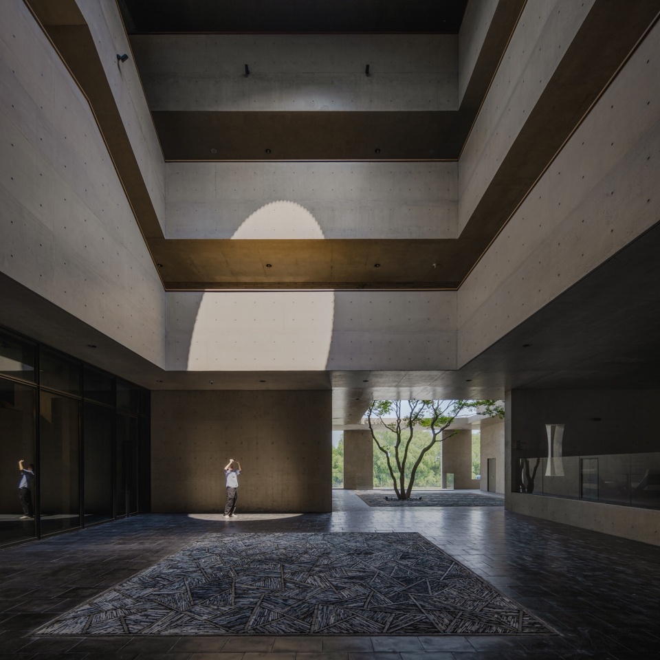雨露阁作为整个建筑群的空间枢纽与多个院子相接,圆形青铜雨斗被放置于高16米的空间顶部,作为屋檐汇集疏导雨水。樟树水院尺度最大,东侧朝太湖方向敞开,南北两侧由两层通高铜网包裹的客房走道环绕界定。河岸边高耸的光塔呼应太湖之水,塔顶高24米,通体采用玻璃砖砌筑而成,映射着天光的变化。
