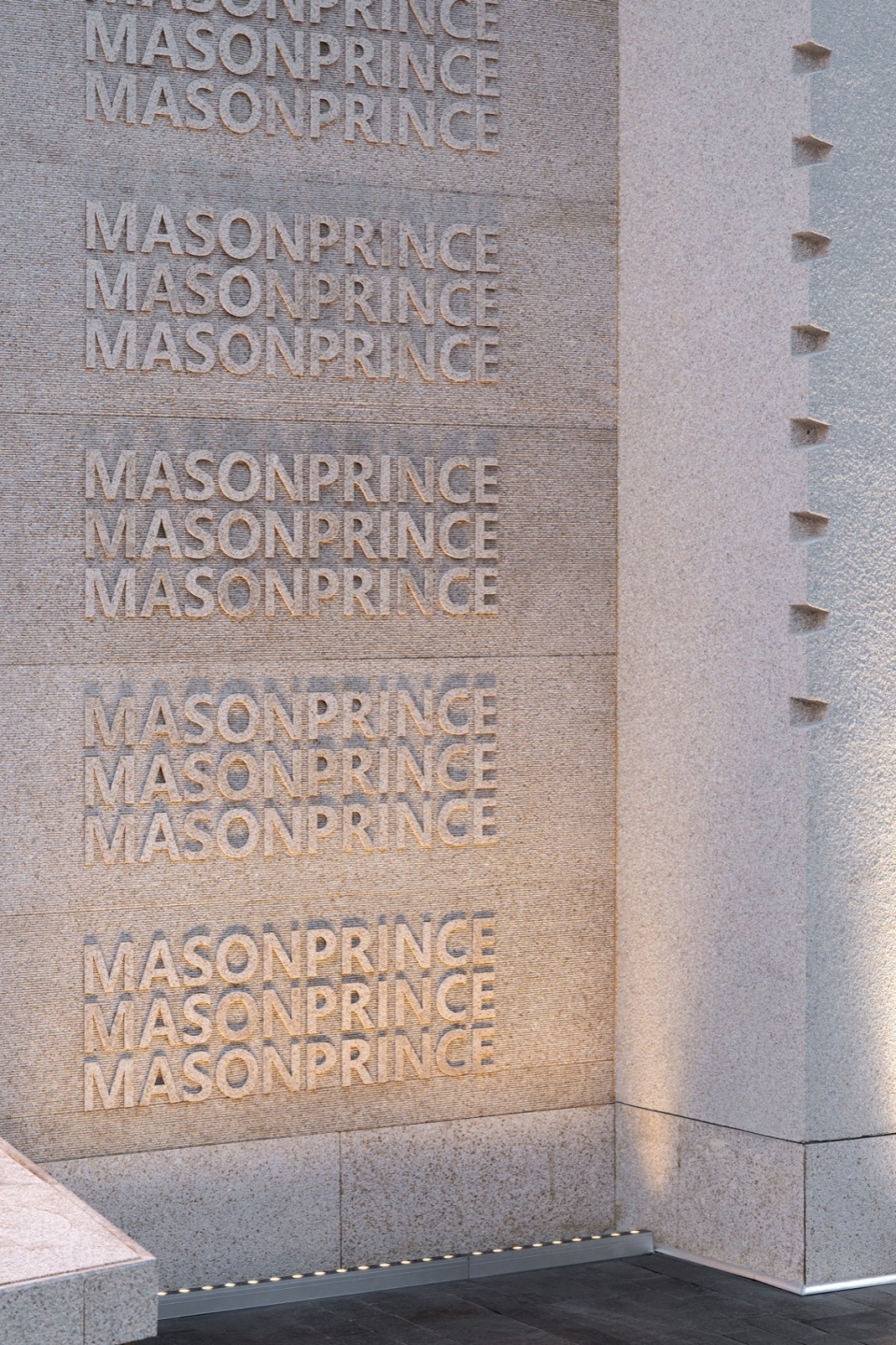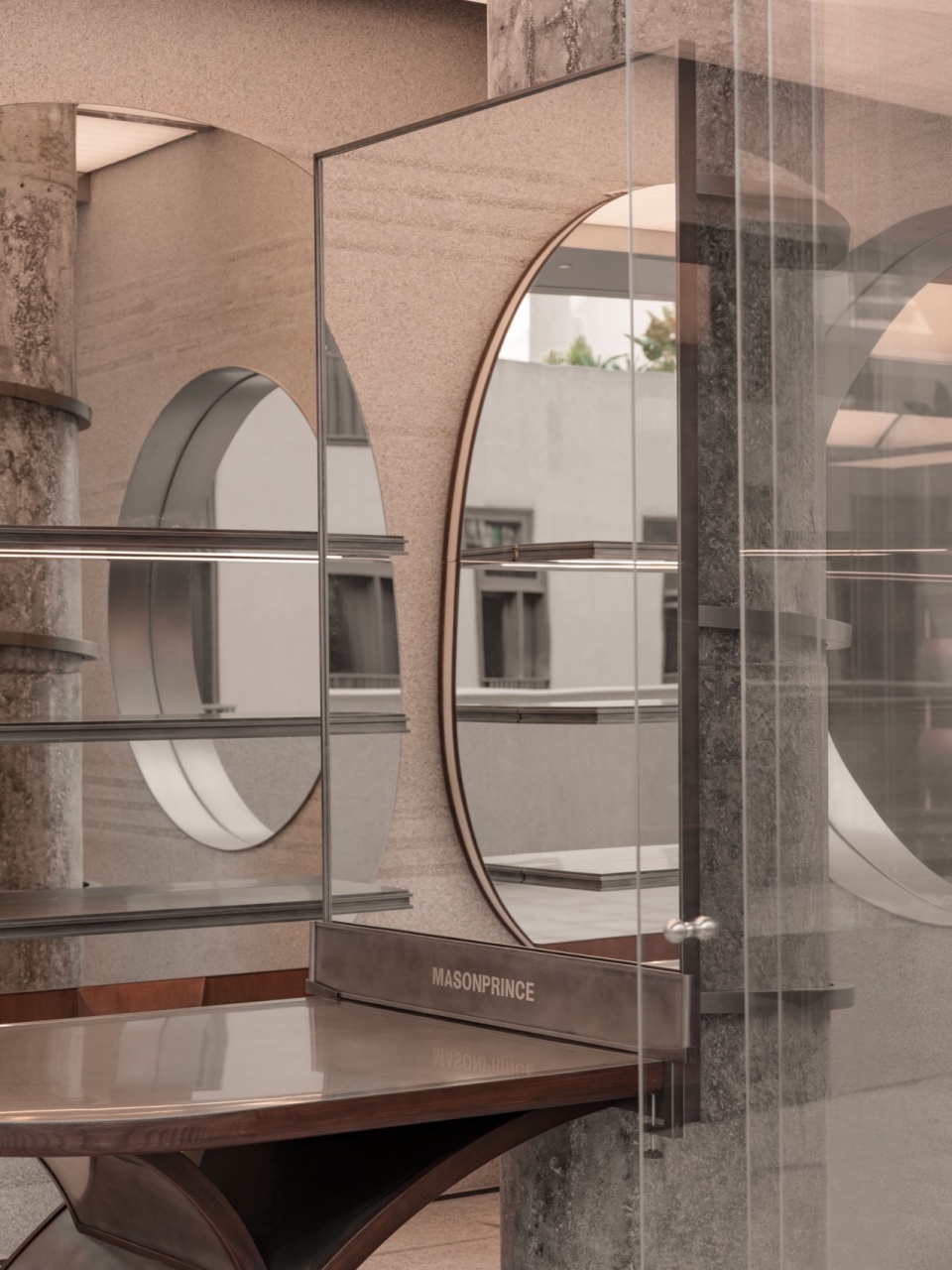 More than mere a design feature, the “MASONPRINCE Flame” is a powerful symbol of the brand’s spirit—representing its boldness to defy conventions, explore new possibilities, and infuse creativity into every facet of life. Stone plaques featuring the brand’s name compose a logo wall, where the repeated, “growing” MASONPRINCE lettering, arranged like flickering flames, establishes a striking visual rhythm and a sense of order. This enhances the brand’s identity while seamlessly directing the spatial flow.