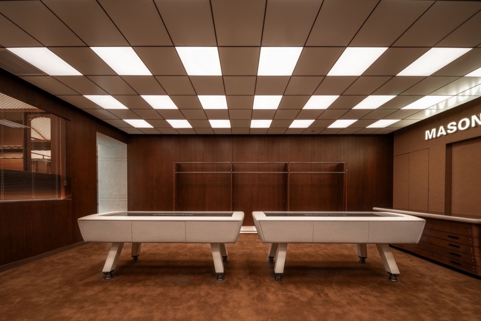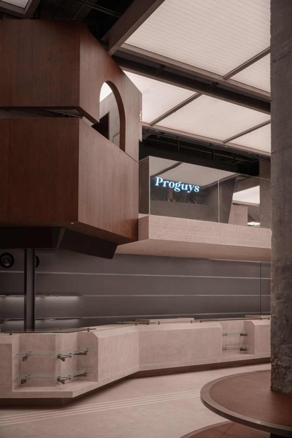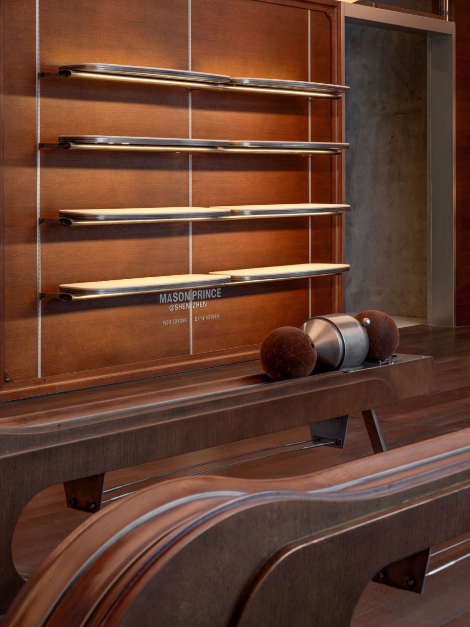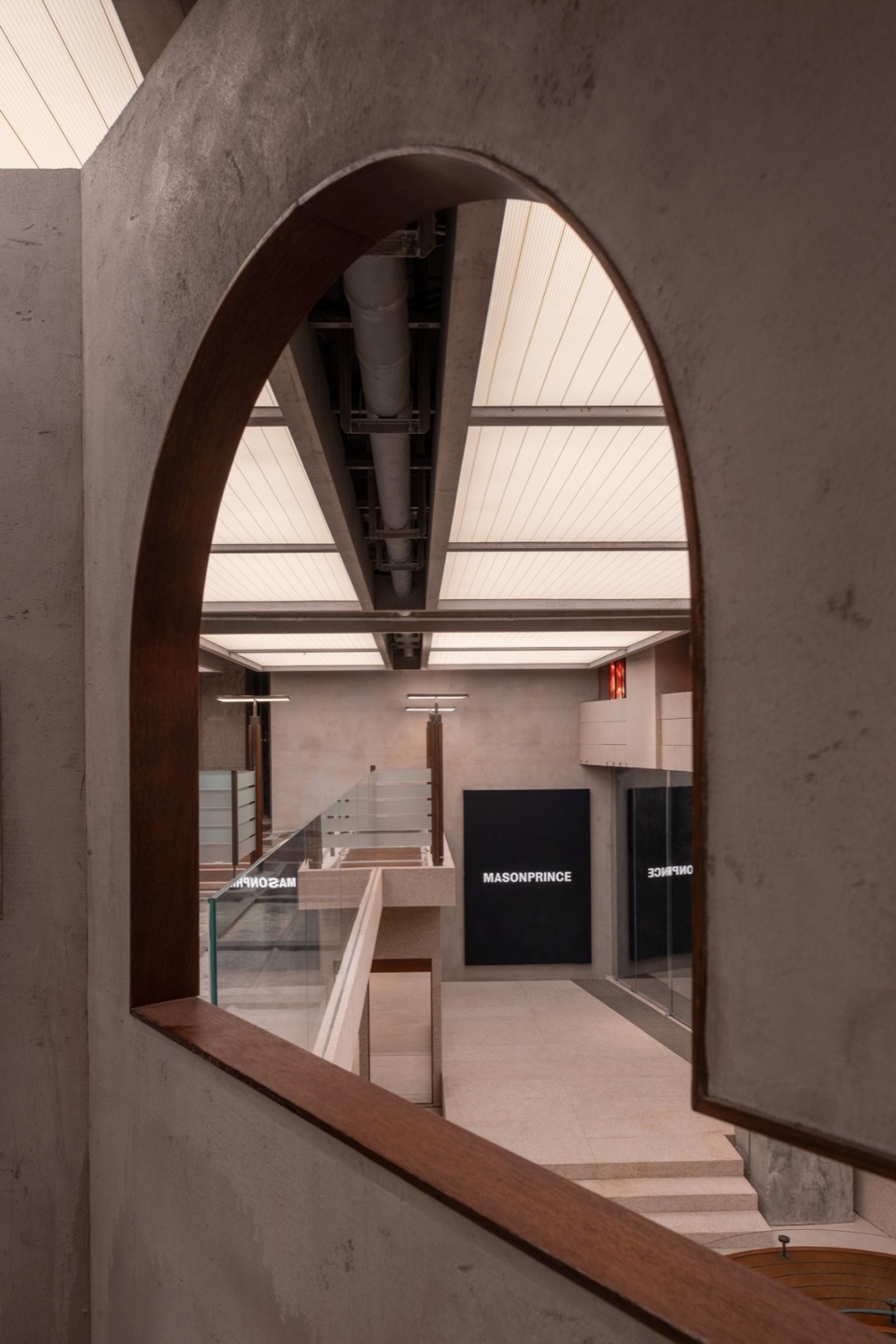 A blend of raw cement framework and classic wood grain defines the color palette, fostering a retro ambiance that is both understated and sophisticated. The exclusive “MASONPRINCE ARENA” merges the dynamic contours of retro athletics with contemporary installations. The design envelops the space in warm, nostalgic tones, boldly reimagining “office” aesthetics within a retail setting. The ground-level running track and metallic display shelves introduce the fluidity of athletic motion.