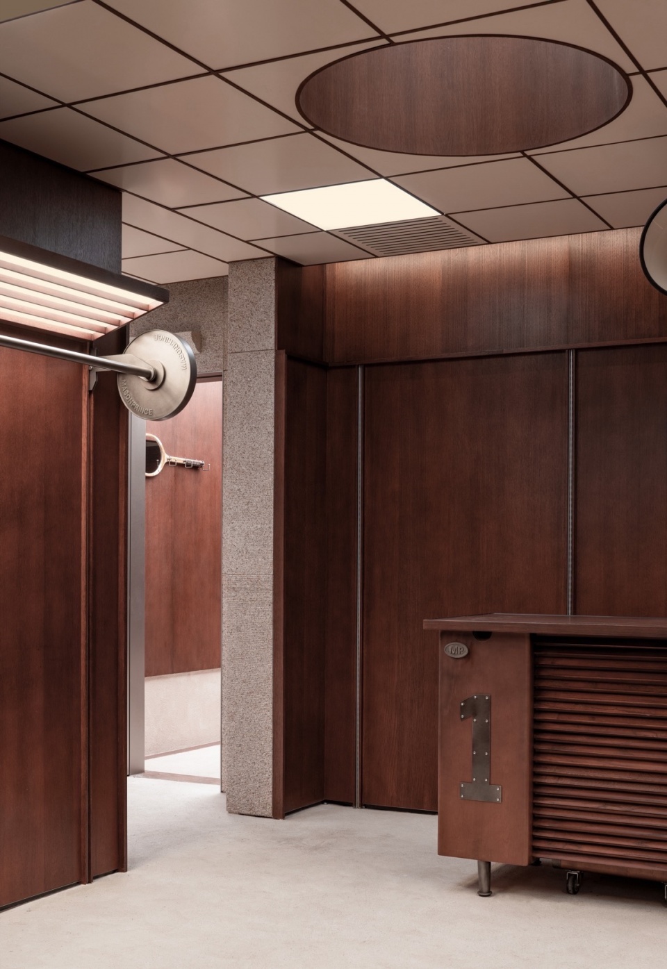 The retro grid ceiling and warm brown wood-texture walls transport visitors to an office in the last century. A clothing folding table, adorned with a vintage horn speaker and the number “1,” displays a fun remix of workplace and sports arena elements, simultaneously resembling a scoring table and an office desk. Nearby, barbells become clothing rails—a surprising, rebellious design that breaks conventions.