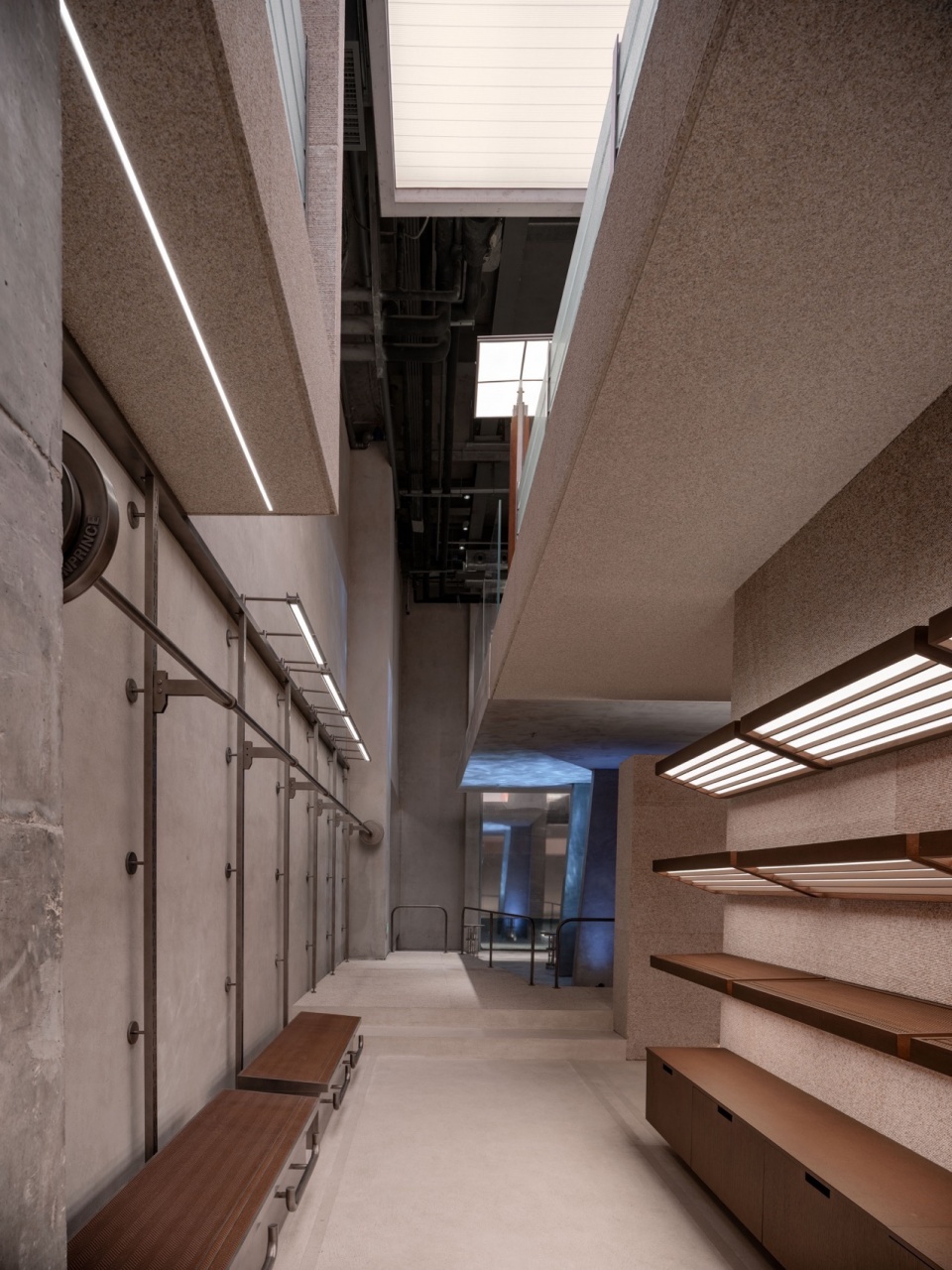 在通道空间中,灯光被隐藏于建筑构造与陈列装置里,以舒适与灵动带来独特的感官体验。行至门店后区,纵跨三层的构筑体极具视觉冲击力直击眼前,开启空间的叙事迁移——贯穿多层空间的柱台,一改前区的暖色“滤镜”,以冷峻而坚硬的裸露混凝土,与立体分层廊台烘托出超然的氛围,竖向的构筑物引人向上探索,踏入新的“跃界台”。