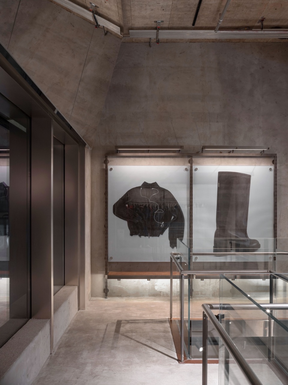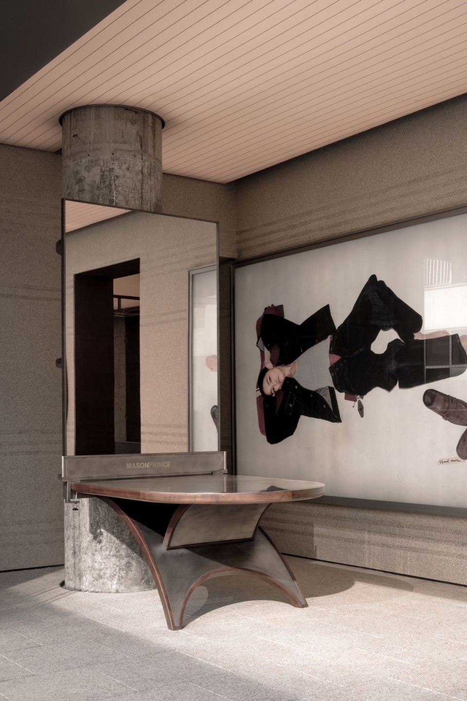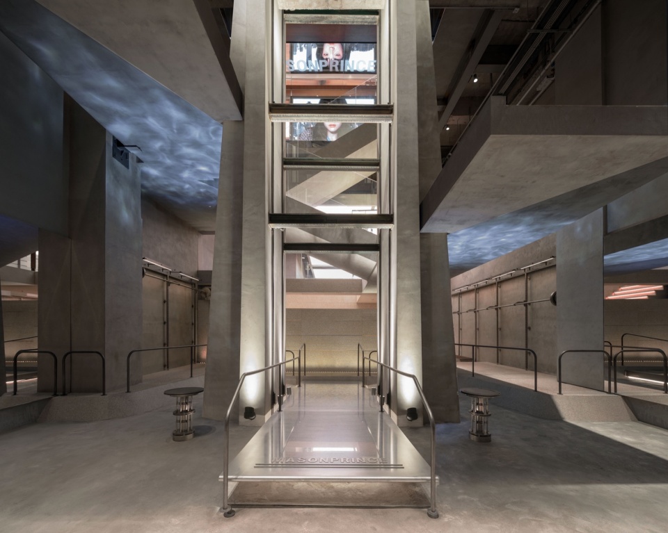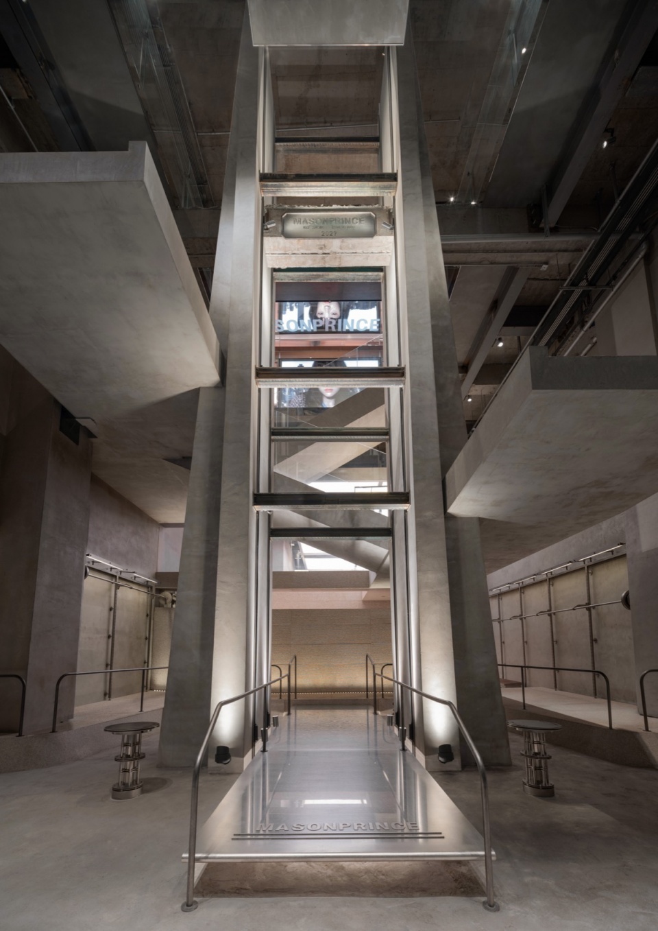 On the top level of the “Psi-Leap Nexus,” exposed concrete walls and ceiling beams, paired with metallic clothing racks, highlight MASONPRINCE’s signature retro aesthetic.