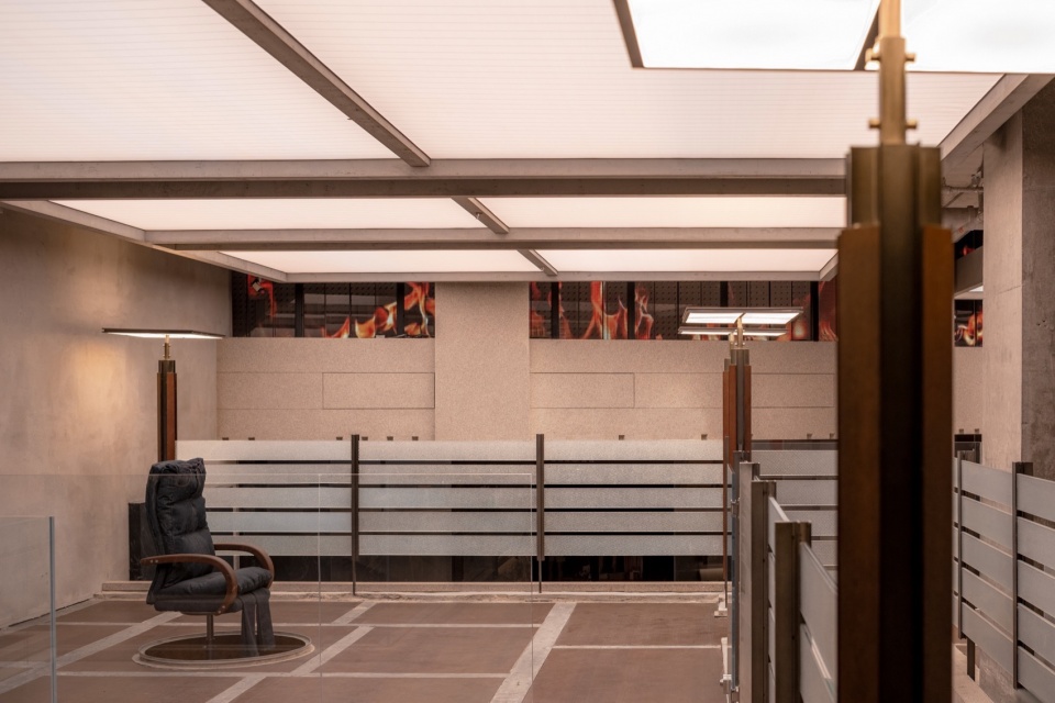 “擂台”之中,一把办公椅单独端坐,无声的对立与冲突,激发人与空间的情感流动与思绪共鸣。动线由“擂台”一侧向后延展,在通透玻璃、原生石材、金属构架等组合下,再次回归“灵能跃界台”的质感与层次,并对话客户对个性与功能的双重追求。