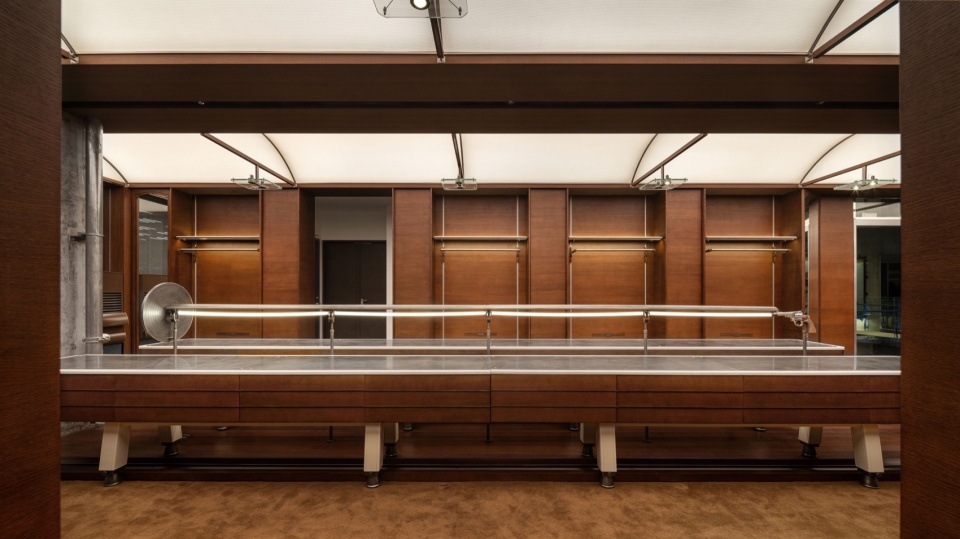 进入场地一隅的试衣间,头顶复古格纹天花板与身旁暖棕色木纹,让人瞬时穿回上世纪办公室。带有喇叭、数字1的叠衣台,将办公元素跟赛场元素的Remix,似是评分台又是办公桌。杠铃的分量,托起了衣物,打破常规思维,实现设计反转。