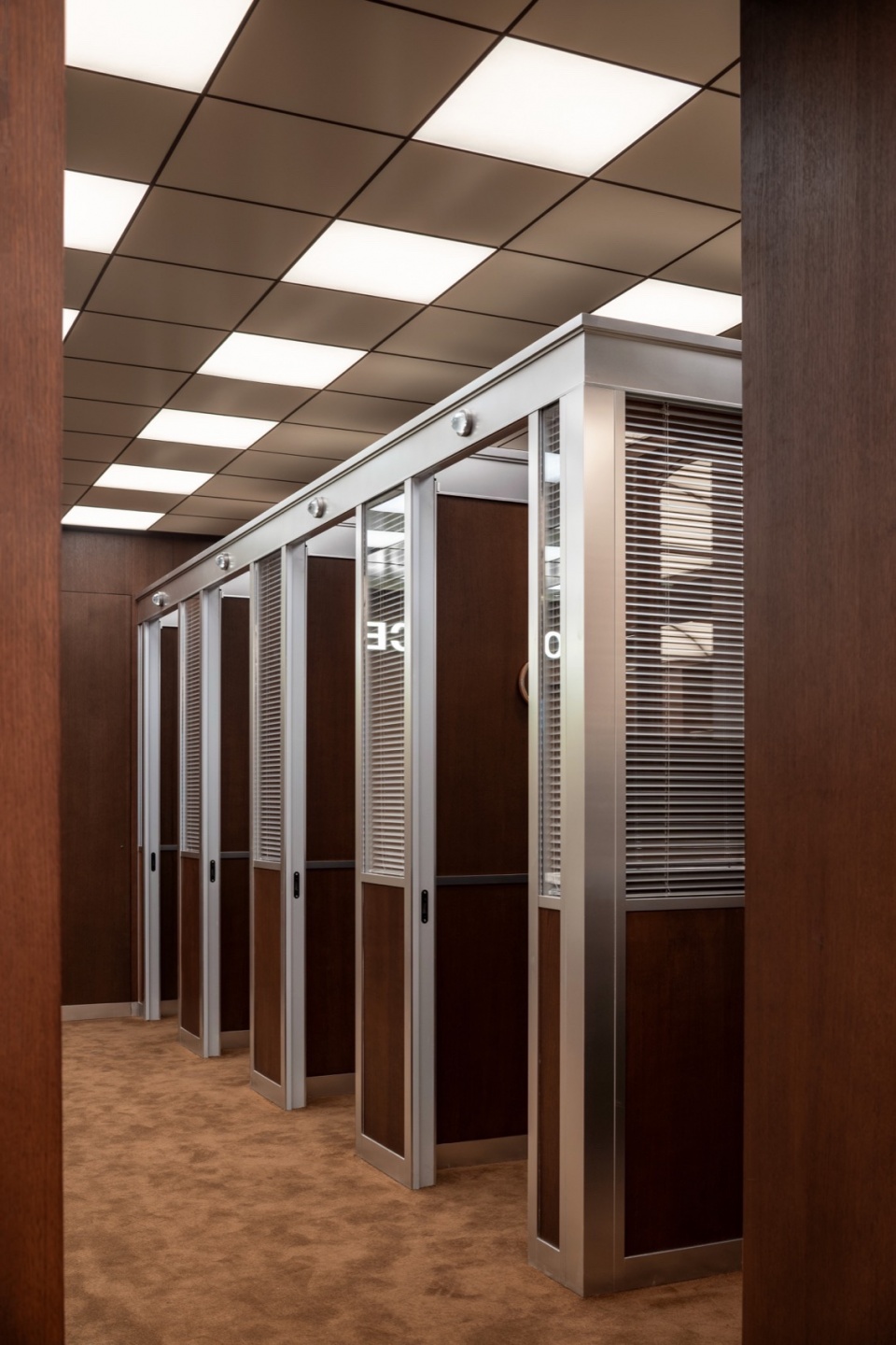 A sweeping expanse of walnut tone meets retro arched ceilings, merging effortlessly under soft lighting.
