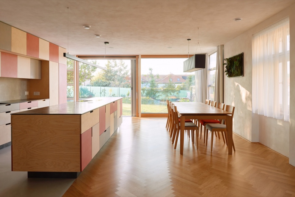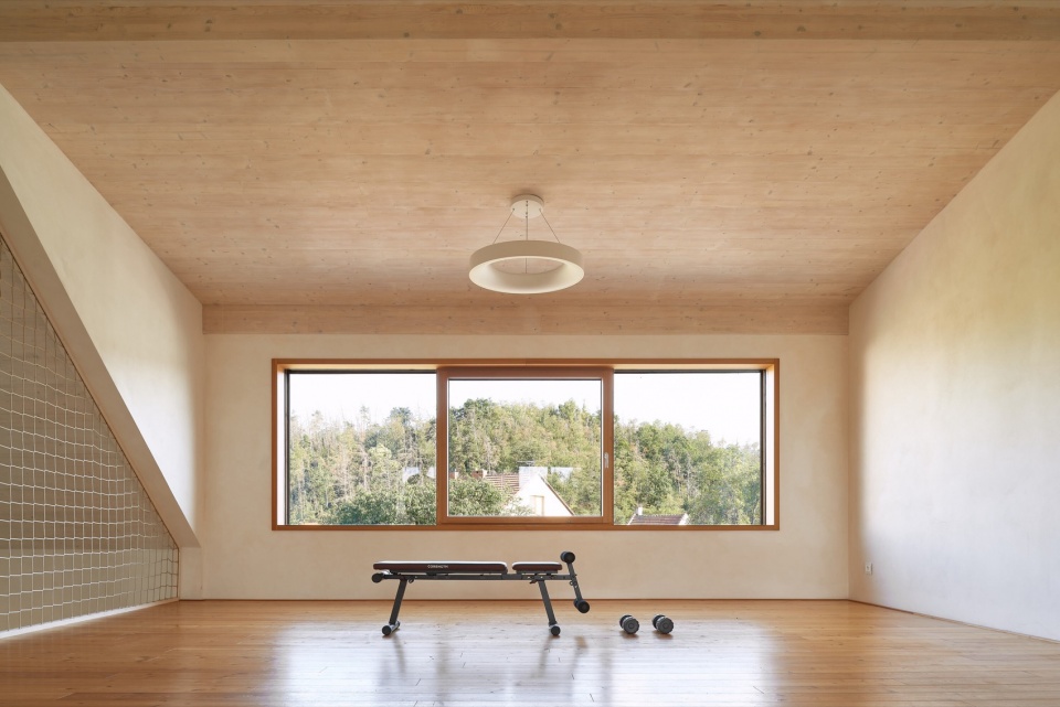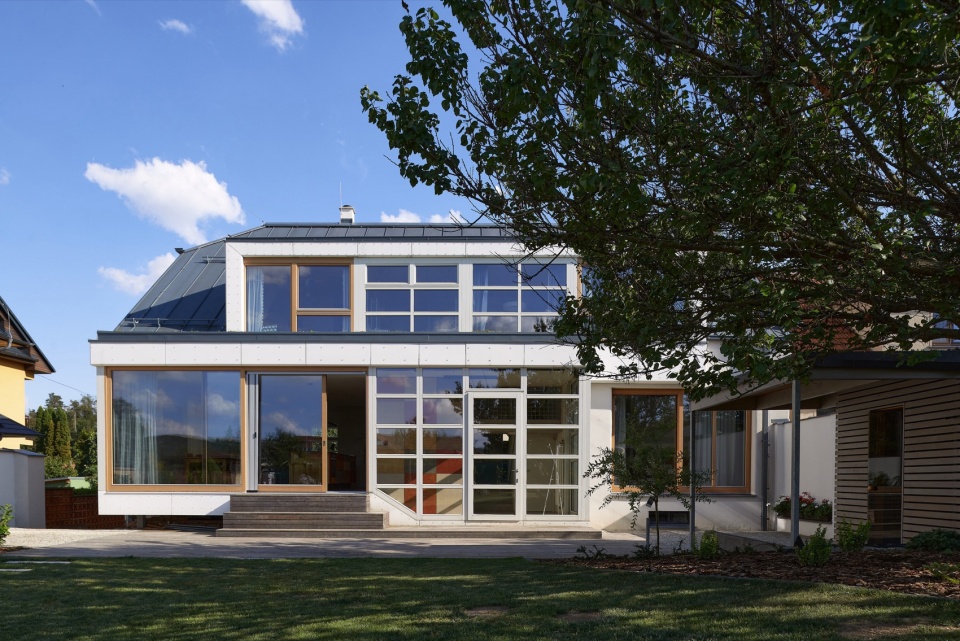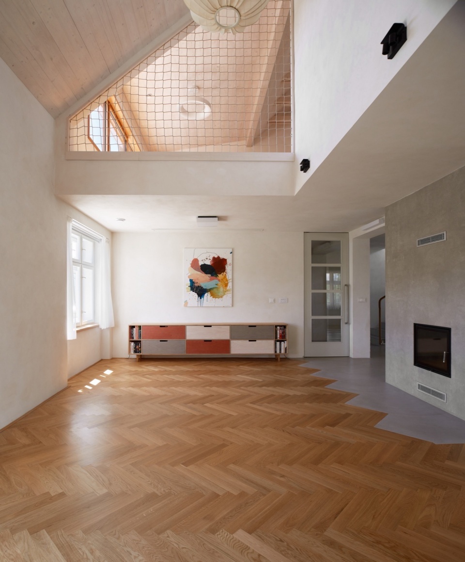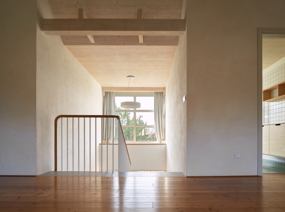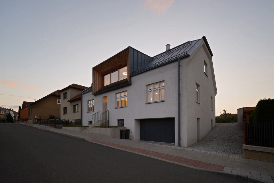 The project deals with the adaptation of half of a semi-detached house from the 50s for the needs of a large family. The life of the family today is different than at the time of construction. Today life is not confined to strictly defined rooms. The main requirement of the residents was to create a large space for living together. This was not compatible with the complicated layout of the house made up of many identical rooms. The house had to be radically transformed from the inside, spatially and operationally – the ground floor had to be opened up. This made it necessary to occupy the attic.