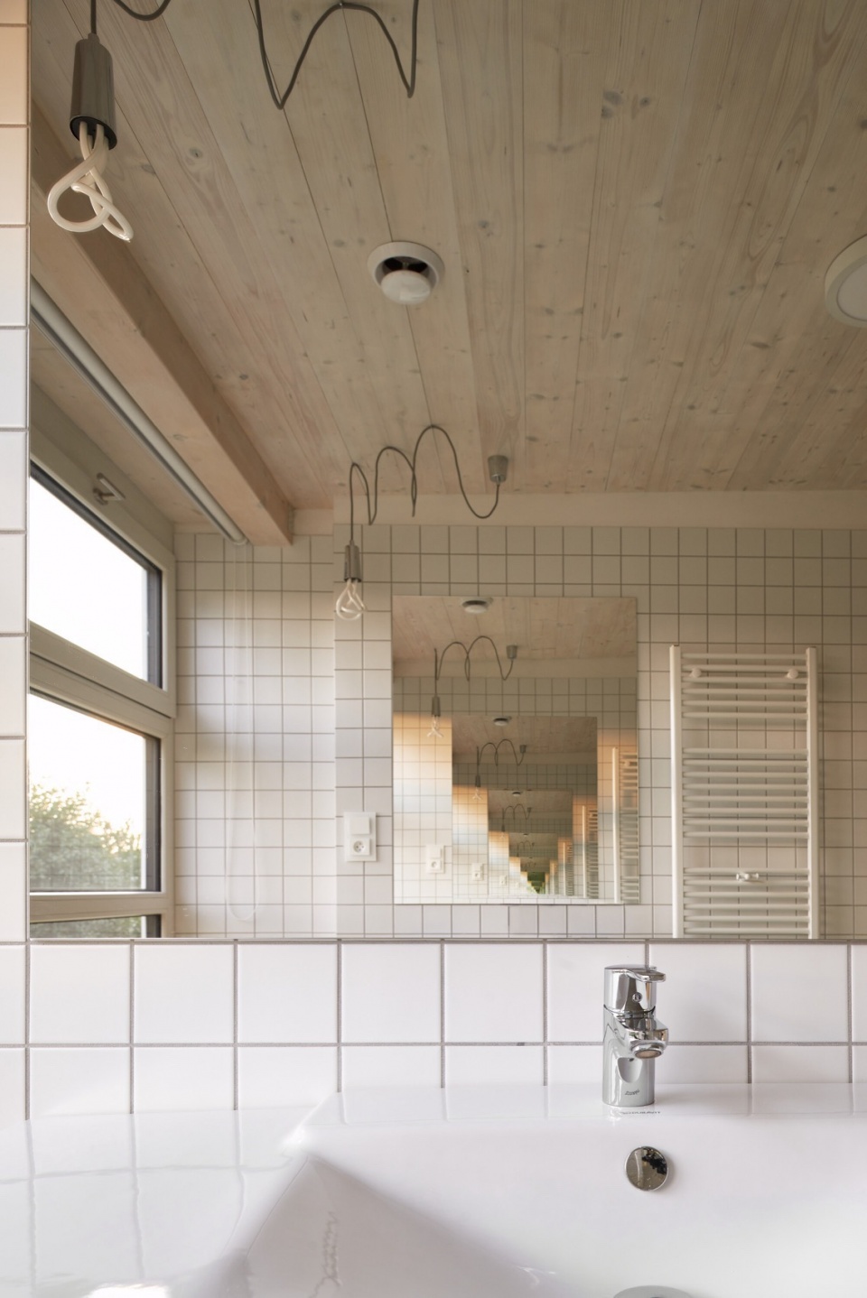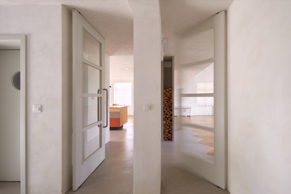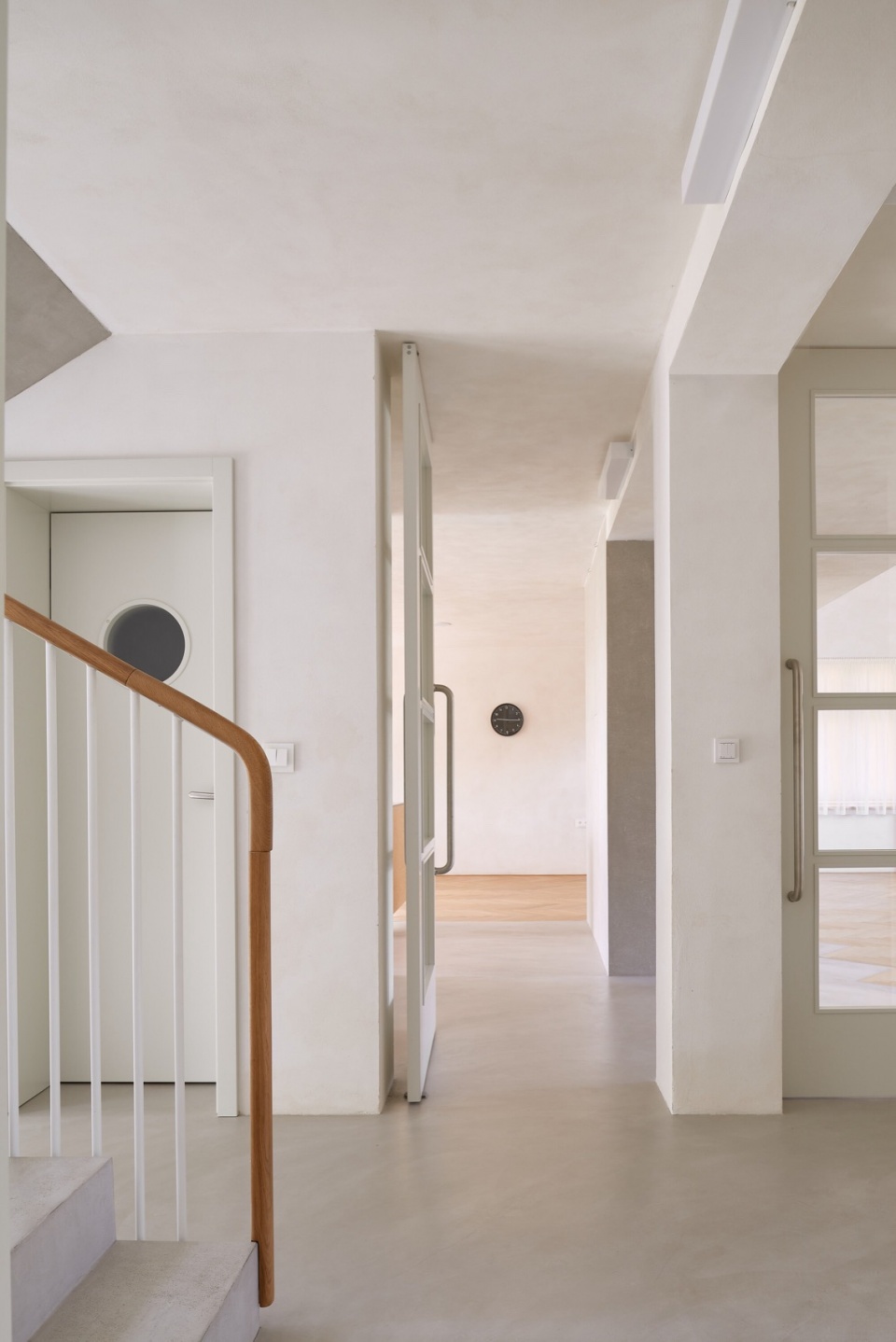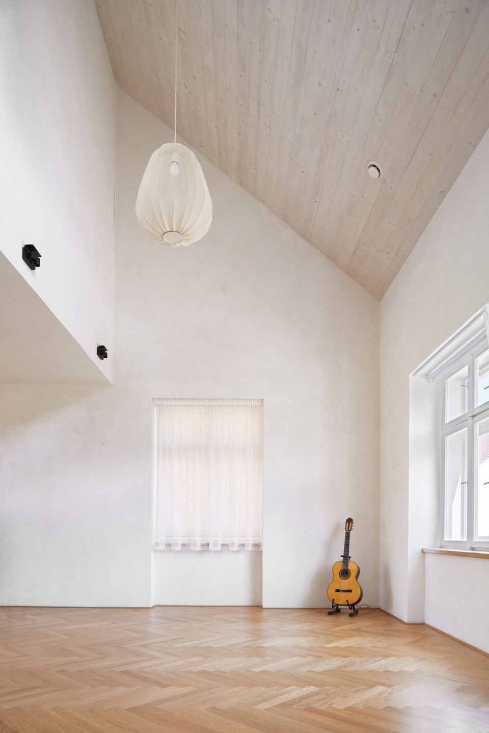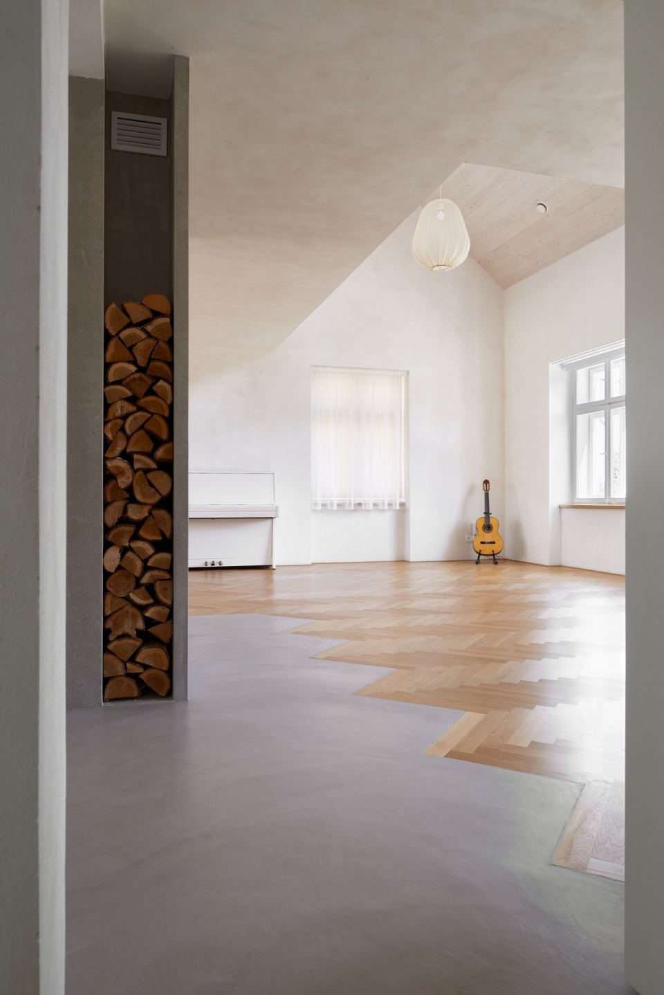 The project deals with the adaptation of half of a semi-detached house from the 50s for the needs of a large family. The life of the family today is different than at the time of construction. Today life is not confined to strictly defined rooms. The main requirement of the residents was to create a large space for living together. This was not compatible with the complicated layout of the house made up of many identical rooms. The house had to be radically transformed from the inside, spatially and operationally – the ground floor had to be opened up. This made it necessary to occupy the attic.