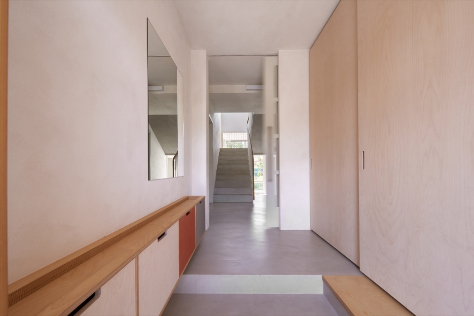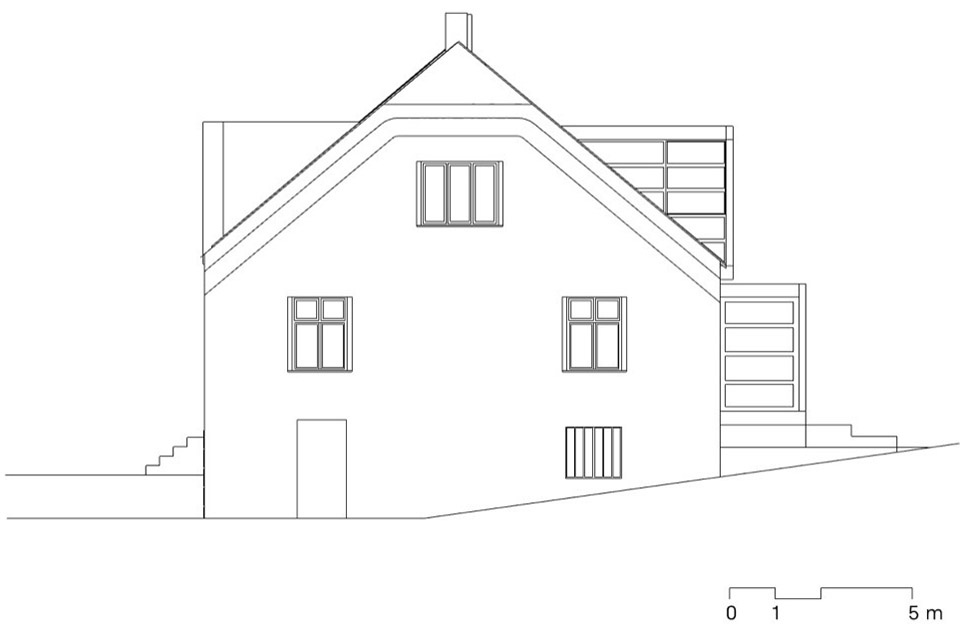 From the courtyard, the strategy is different – the house opens up as much as possible. A glass room is attached to the house and its motif is repeated on the first floor.