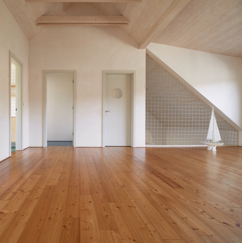 Instead of a labyrinth of chambers and rooms, we create a large common space with a fireplace in the middle. In order to make the space not only large but also have a quality of height, we move the ceiling above part of the living space and connect the lounge area with the playroom upstairs. This in turn reinforces family togetherness. On the first floor, the children’s rooms are situated around the playroom.