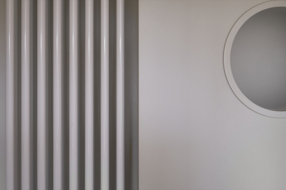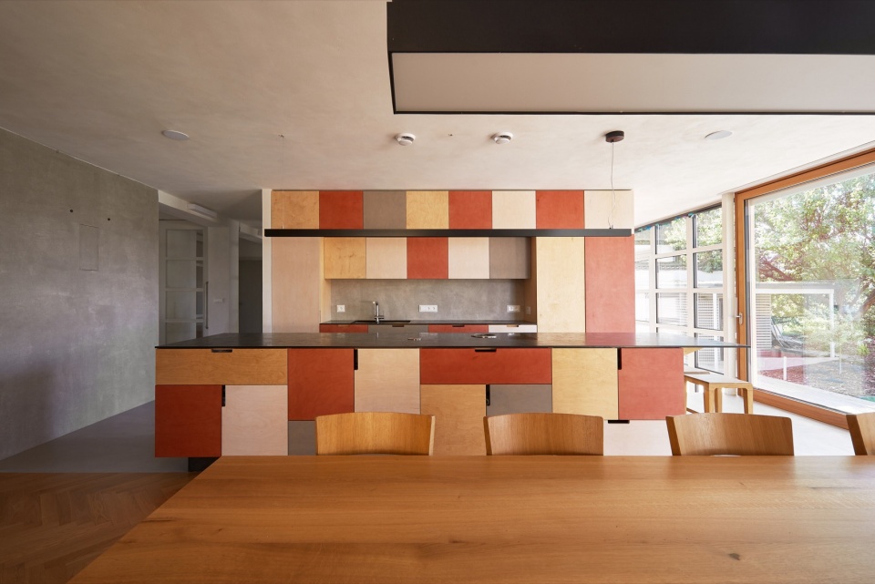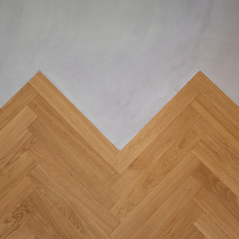 The interior wants to be welcoming. It overwhelms its inhabitants with an excess of structures and textures. Wood in various finishes, squeegees, and paint where the workmanship of the human hand is evident. Yet we don’t shy away from colour.