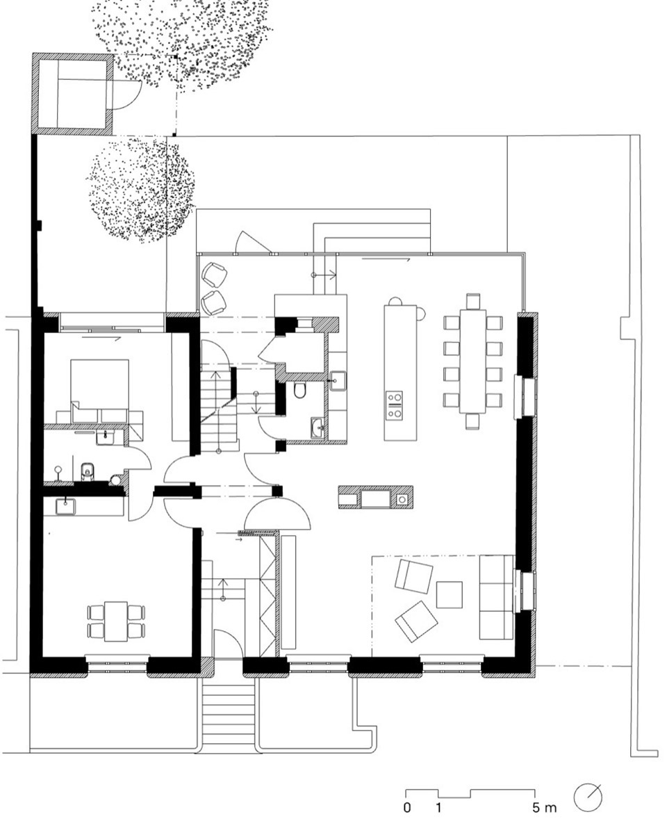该项目旨在改造一栋建于20世纪50年代的半独立式住宅,以满足一个大家庭的现代生活需求。如今,家庭生活方式已不同于房屋建造时的设定,不再受限于传统的房间划分。住户的核心诉求是创造一个宽敞的共享空间,但原有的房屋布局由多个相似的房间组成,过于零碎,与这一需求不兼容。因此,空间和功能必须被彻底重塑——首先是打开底层空间,同时阁楼的使用也变得必要。