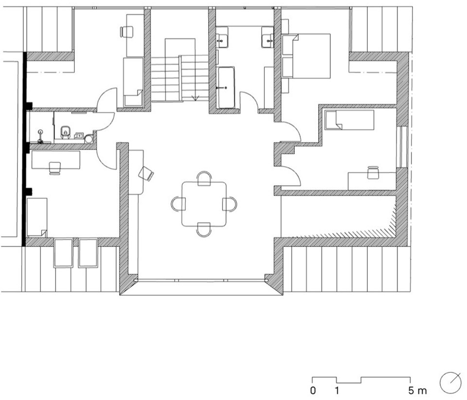 Just as the relationships within the layout have changed, so too has the relationship to the exterior. The courtyard is no longer a utilitarian space from which the house turns away, since it is not anymore used for production. Rather, it is a space for recreation – the main living space spreads its influence through the new glass room. In the warmer months, the backyard is a natural extension of the living space.