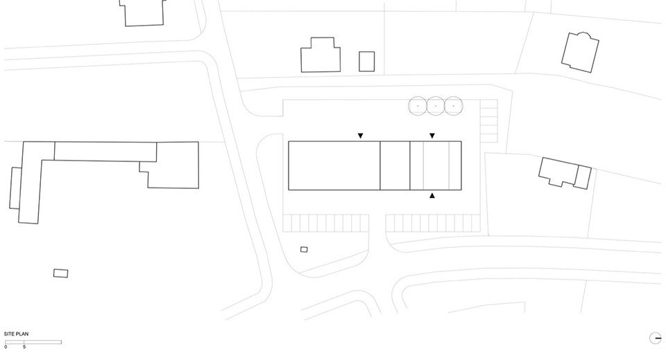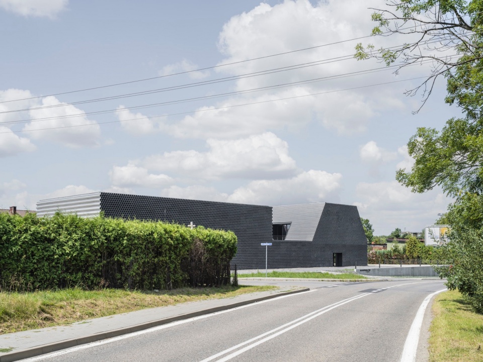 从街道一侧望去,这座建筑构成了明确的城市界面;而从住宅区方向望去,其体量被打散,有机地融入周围松散的建筑语境中。尽管初期计划使用Gambit的管道材料作为立面,但由于其为地下专用,不耐紫外线且不符合防火规范,最终被替换为原色铝板。这种材料不仅成本更低,也在建筑师以往项目中获得良好验证(如 OUTrial House、Unikato 和 Konieczny’s Ark)。铝板随时间氧化后会形成包浆,呈现出如混凝土般的哑光质感,朴素且富有原始韵味。此外,这种材料坚固耐久、几乎无需维护,符合建筑师一贯倡导的可持续策略——在建筑生命周期中,运行阶段往往占据高达30%的碳排放,因此他们始终倾向于选择低维护、低影响的建造方案。