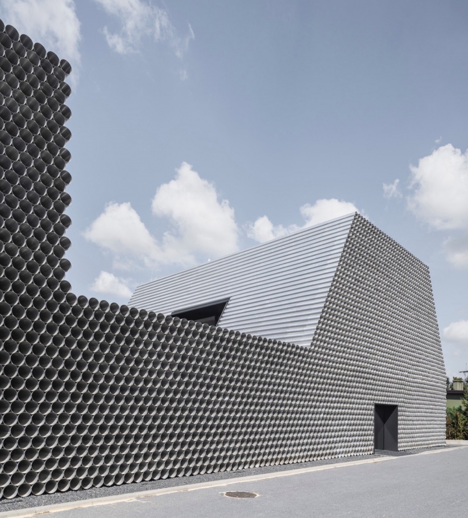 The Gambit building forms a frontage from the street, while, when viewed from the residential district, its fragmented volume blends into the dispersed context. The façade was ultimately not made from Gambit pipes—designed for underground use—as we found that they oxidised under UV light and did not meet fire safety requirements. Instead, we reached for inexpensive, raw aluminium sheeting, which was not only cheaper but also proven in our previous projects such as the OUTrial House, Unikato, and Konieczny’s Ark. This material develops a patina over time, taking on a matte, raw character reminiscent of concrete. Importantly, the sheet is incredibly durable and virtually indestructible, making it easy to maintain. This is crucial for us because the operation of buildings generates up to 30% of CO₂ emissions, so we always seek simple, low-maintenance solutions.